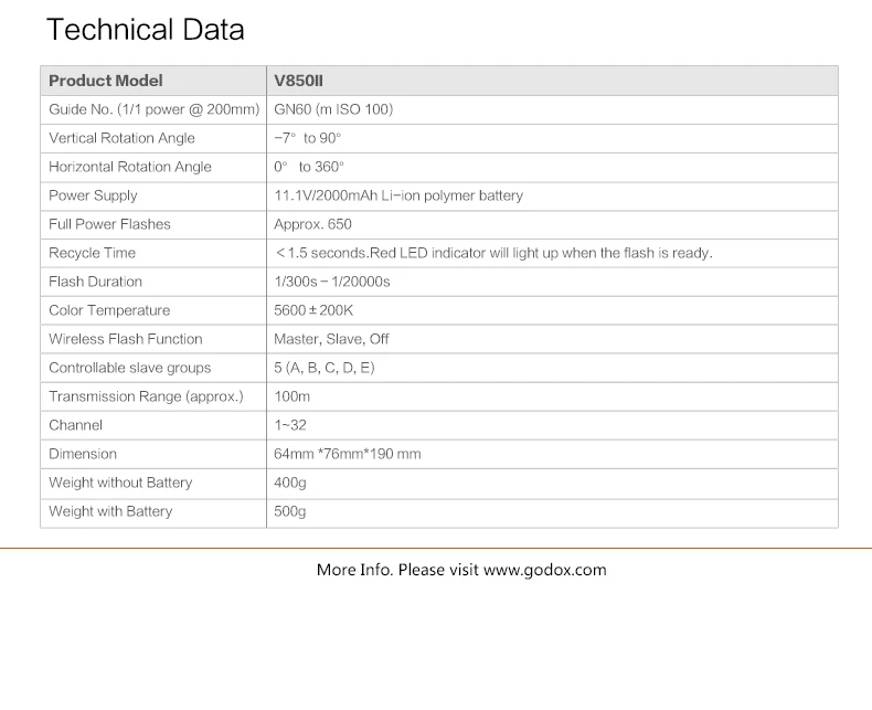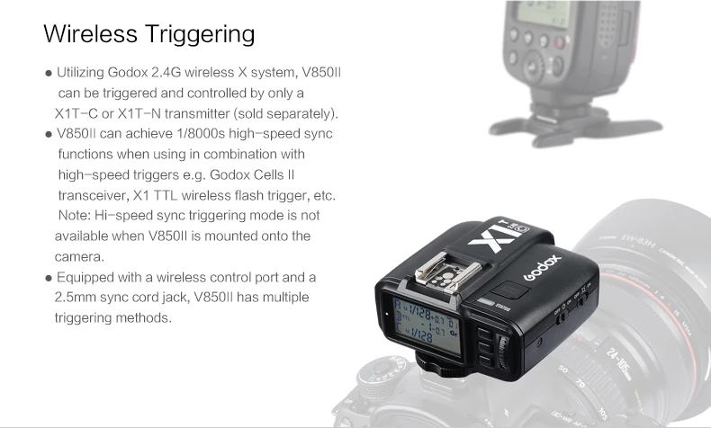 - -Со встроенной беспроводной системой Godox 2,4G X, V850II совместим с