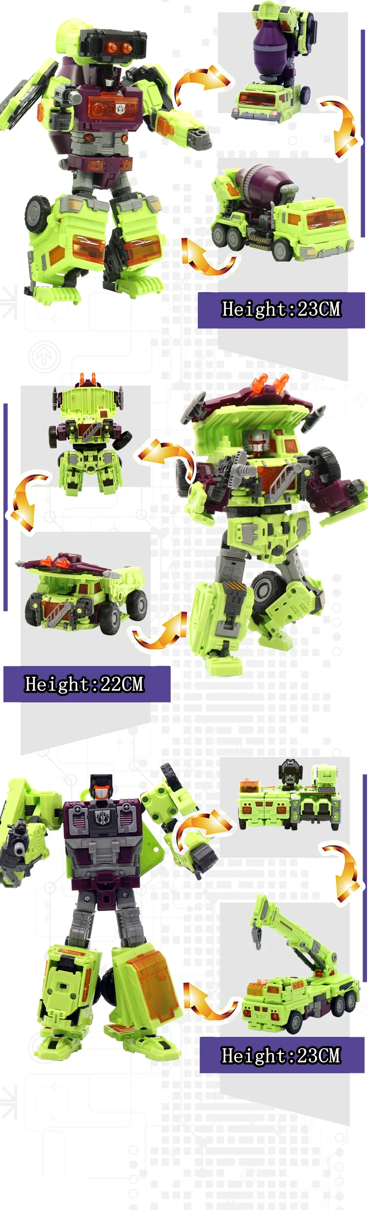 Каждый набор может трансформировать 2 модели, робот или инженерный грузовик. Все 6 наборов могут собрать комбинатор. Он идеально подходит для коллекционного дисплея, а также может использоваться в качестве игрушки или подарка.