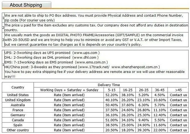 4. как правило, процесс подготовки продуктов составляет 3 рабочих дня. информация о треке обычно появляется через 7-10 дней после отправки товара.