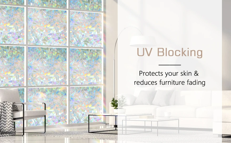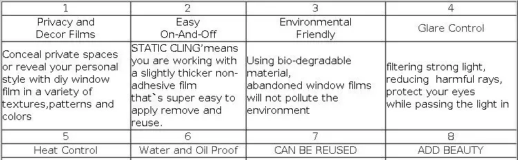 1. Уникальное Украшение: Обновите стеклянные окна и двери с этими современными и элегантными узорами 2. Красивый эффект радуги: создает потрясающий эффект радуги, когда солнечный свет просвечивает 3. Уменьшение бликов: смягчает сильный естественный светильник, чтобы создать комфортную рабочую и учебную среду 4. Защита конфиденциальности: блокируйте нежелательные виды, чтобы вы могли чувствовать себя свободно в своем личном пространстве 5. Конструкция без клея: статическое прилипание к поверхности стекла водой, отсутствие необходимости в токсичных клеях. 6. УФ-Блокировка: отклоняет большинство УФ-лучей для предотвращения повреждения кожи и выцветания мебели 7. Съемные и многоразовые: без хлопот оставляя липкий остаток при удалении, можно повторно установить несколько раз
