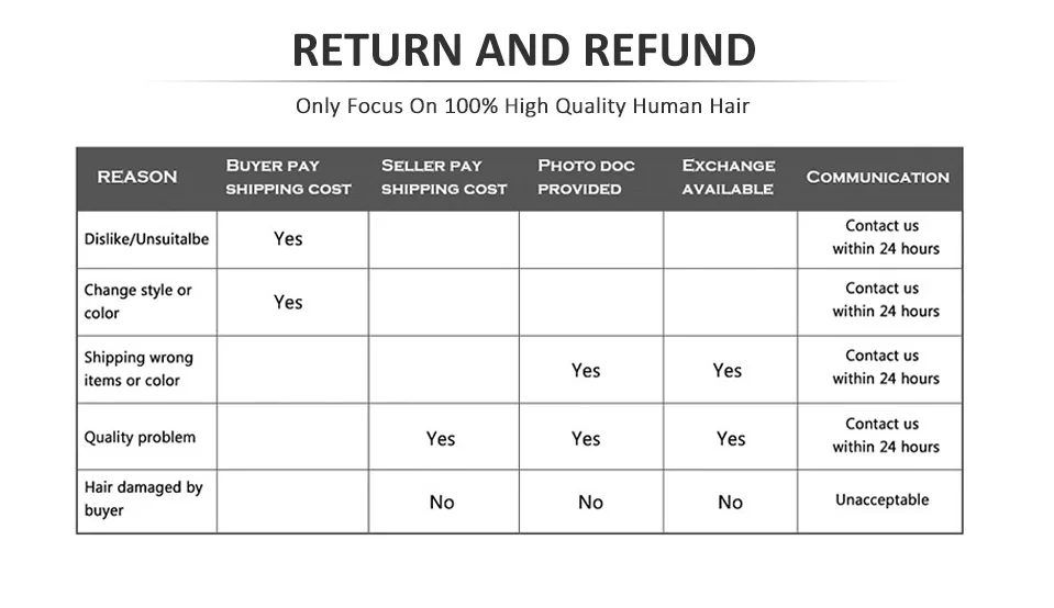 3) мы покроем стоимость возврата для низкого качества волос, огромная разница в цвете. По личной причине возврата вам потребуется оплатить стоимость возврата.