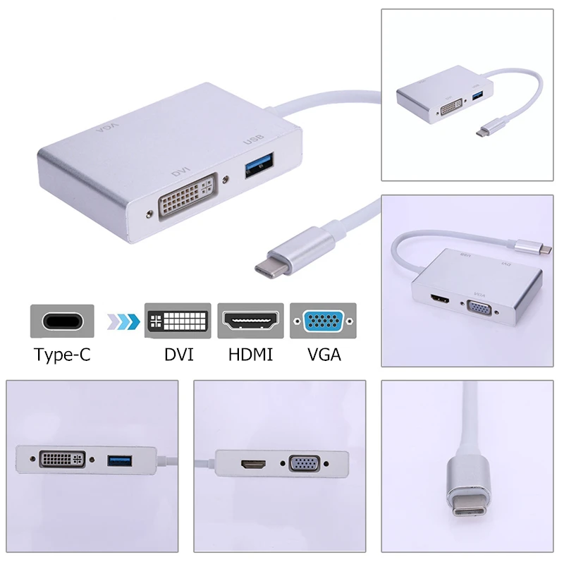 Тип 1: Type-C к HDMI/VGA/DVI/USB 3,0; Тип 2: Type-C к HDMI/VGA; Тип 3: Type-C к HDMI/VGA/Type-c/USB 3,0. Характеристики выходного интерфейса: 1.USB 3,0: скорость передачи 5 Гбит/с, обратная совместимость USB2.0, подключи и работай 2.HDMI: 4K(3840x2160 @ 30 Гц)/1080P/720P. 3.VGA: 1080p/720p. 4.DVI: 1080P/720P. 5. Тип c: только зарядка. 20В/5А, 5-45 Вт. Совместимое покрытие: Apple Macbook Air Pro/Surface pro/iPad pro/Dell XPS13 15/Dell Precision5510/ HP Envy 13 15/HP Spectre X360/HP Elitebook/HP Zbook Studio/Acer Swift 5/Acer TravelMate /Acer Nitro/Chromebook R13/Google Chromebook Pixel/Lenovo 900 910/Thinkpad X1/Xiaomi Airbook/LG G5/Sumsang Notebook/Galaxy S8 9 10 20/Note8 9 10/Huawei Matebook/p20 30 40 Pro/mate10 20 30 pro/xioami 10/OnePlue 8.