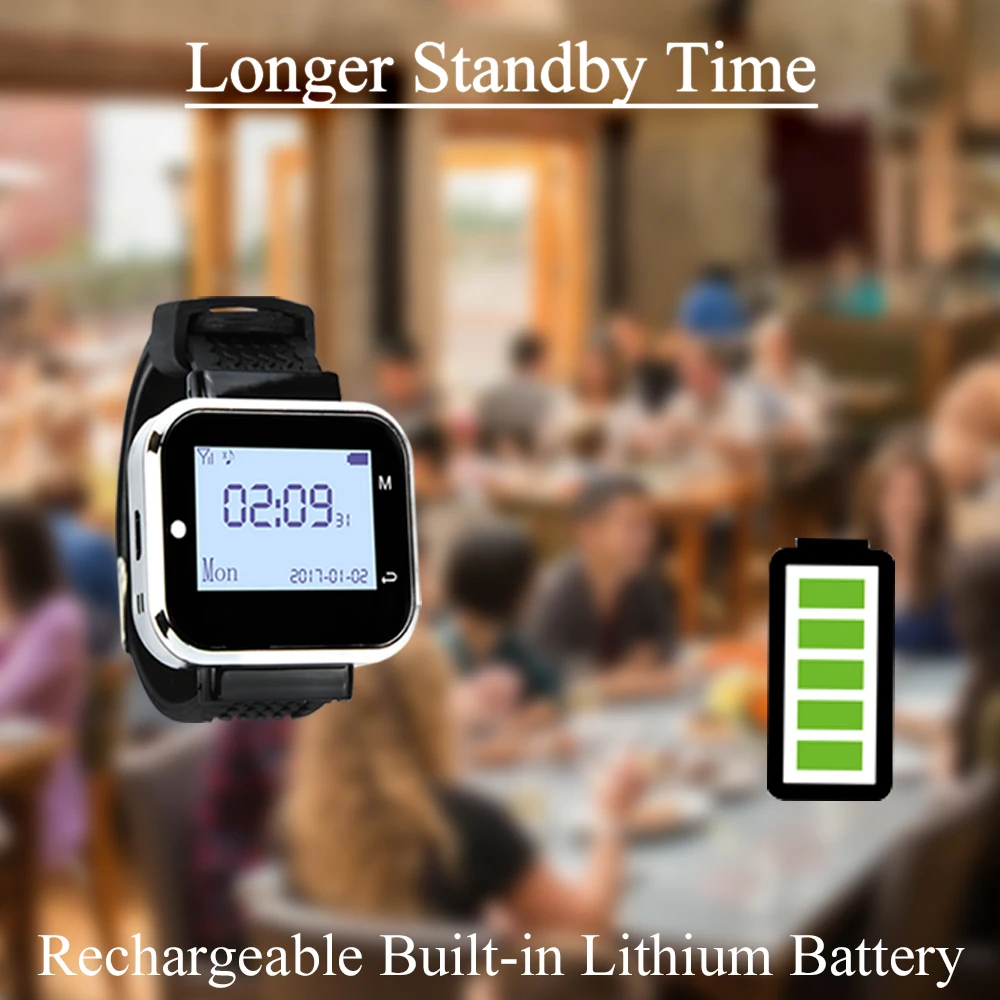 Описание:Спасибо за посещение нашей веб-страницы с кнопками беспроводного вызова.Теперь Наши беспроводные системы вызова широко используются в фаст-фудах, пищевых кортах, клиниках, церкви, больницах, спа и салонах, автомагазинах или других случаях очереди. Они приветствуются и популярны.Преимущества:Экономия затрат на рабочую силуУлучшение изображения обслуживанияСамое главное, повышение эффективностиКак использовать:Во-первых, кнопки вызова вставляются или ставятся на стену или на стол, когда у гостей есть какие-либо услуги, он или она нажимает кнопки вызова, приемник (светодиодный экран или пейджер часов) получите сигнал с вибрацией или звуком, показывая номер таблицы, Тогда официант будет знать, какой стол будет подан.CTW06 функция пейджера часов:Беспроводная технология RFМодный дизайн часовМатричный ЖК-экранДо 999 каналовКнопка вызова поддержка передачи данных под заказКнопка вызова слова выбираютсяРежим отображения одного или спискаТочный дисплей времениВибрация/звуковой сигналИндикация низкой мощностиВстроенный Съемный перезаряжаемый аккумуляторCTW06 часы пейджер Технические данные:1). Емкость: 500 шт. передатчиков пейджеров2). Китайский и английский3). Режим оповещения: вибрация, кольцо или вспышка4). Чувствительность:-110 дБм5). Хранение: 20 телефонных номеров (для организации очереди)6). Режим питания: 250 мА · ч литиевая батарея7). Время работы в режиме ожидания: 7 дней (в идеальных условиях)8). Частота: 433,92 МГц9). Совместимость с кнопками 1, 2, 3, 4, 510). Размер: 50*41*14 мм (не включая ремешок)11). Цвет: черный12). Материал: пластик