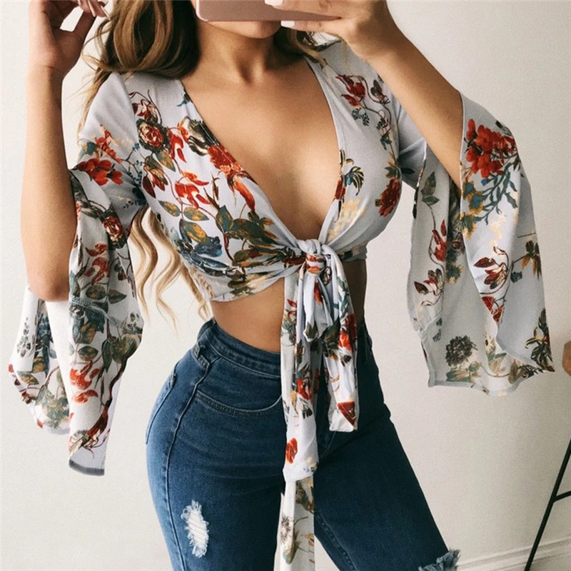 Женская блузка с длинным рукавом, женская рубашка с цветочным принтом, офисная женская рубашка, модная шифоновая блузка с v-образным вырезом, женская одежда