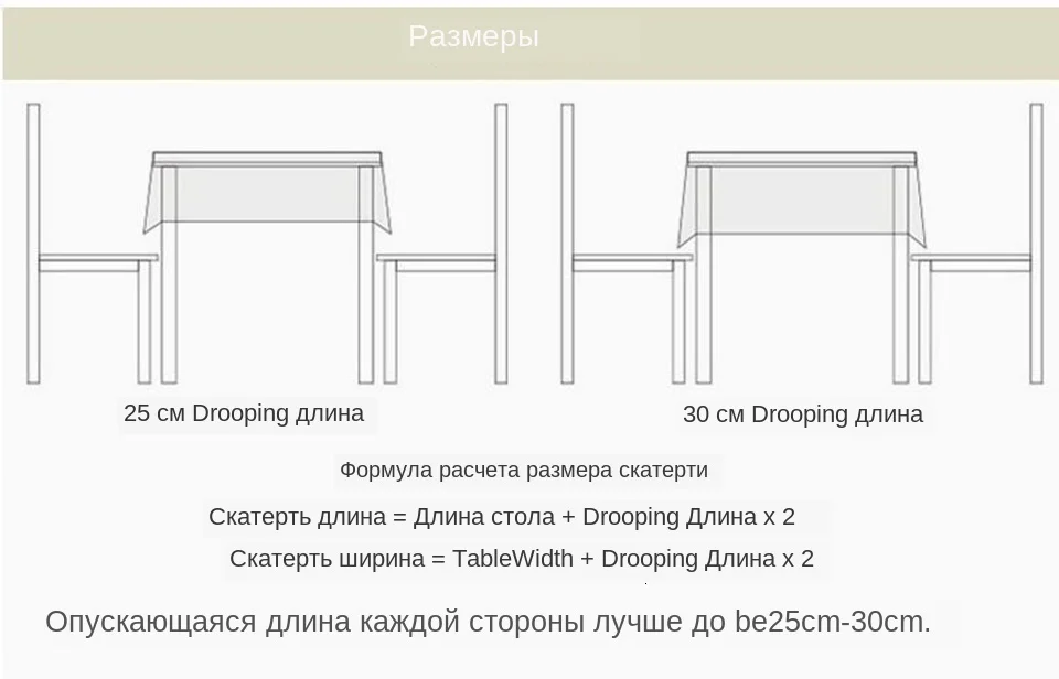 B. Ширина стола + 25/30 см x 2 = скатерть ширина