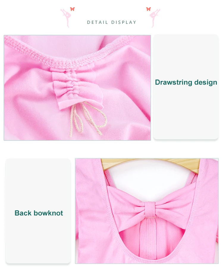 Стиль: детское балетное платье Материал: 95% хлопок + 5% спандекс Цвет: розовый, лавандовый, ярко-розовый Размер: 105-170 Рукав: короткий рукав или длинный рукав Особенности: бант