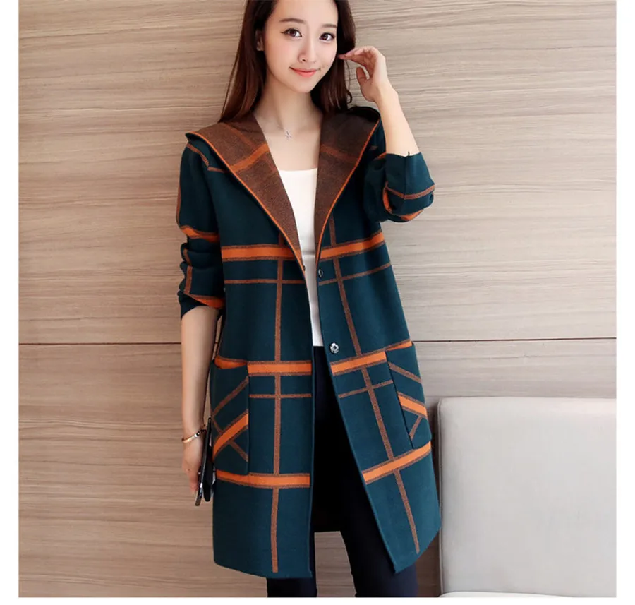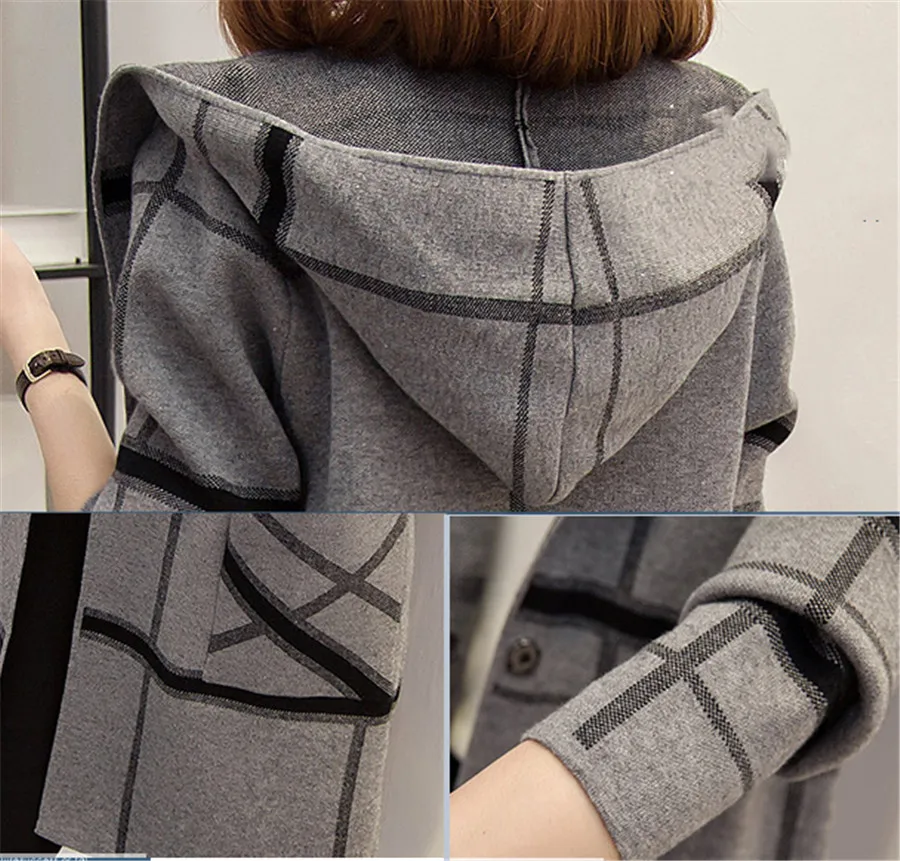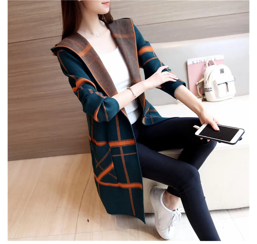 2020 осенний длинный свитер пальто женский длинный рукав с капюшоном клетчатый свитер тонкий кардиган свитер женский элегантный повседневный вязаный Топ FC183