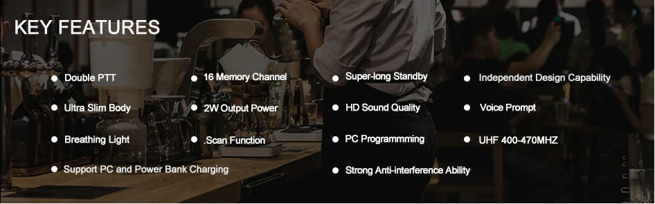 1. 16 Каналы 2. Выходная мощность: 2 Вт 3. Голосовая подсказка 4. Функция VOX 5. Функция сканирования 6. Функция скребок 7. Таймер таймера (TOT) 8. Экономия батареи 9. Гарантия низких Батарея Предупреждение 10. TX концевой тон 11. Блокировка занятого канала вне 12. Уровень шумоподавления регулировки 13. CTCSS/DCS декодирование и кодирование 14. Широкая/узкая полоса 25 кГц/12,5 Кгц