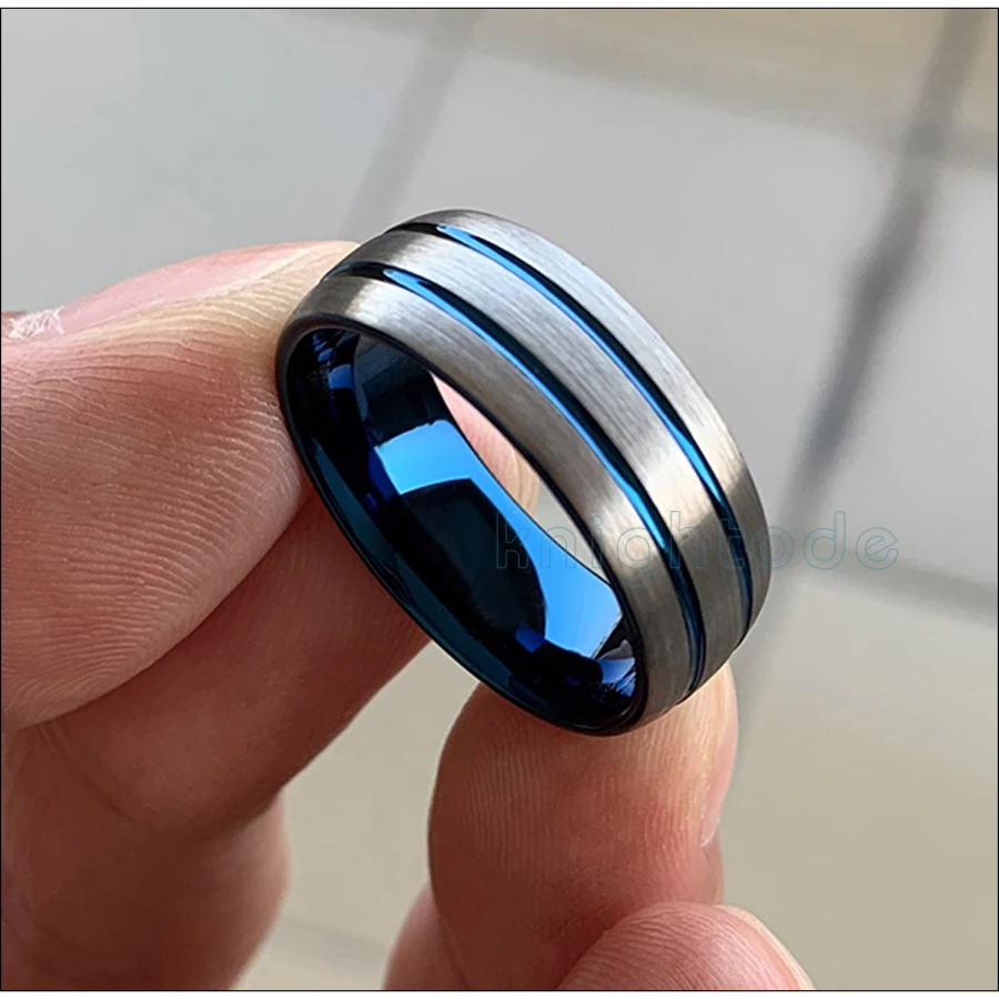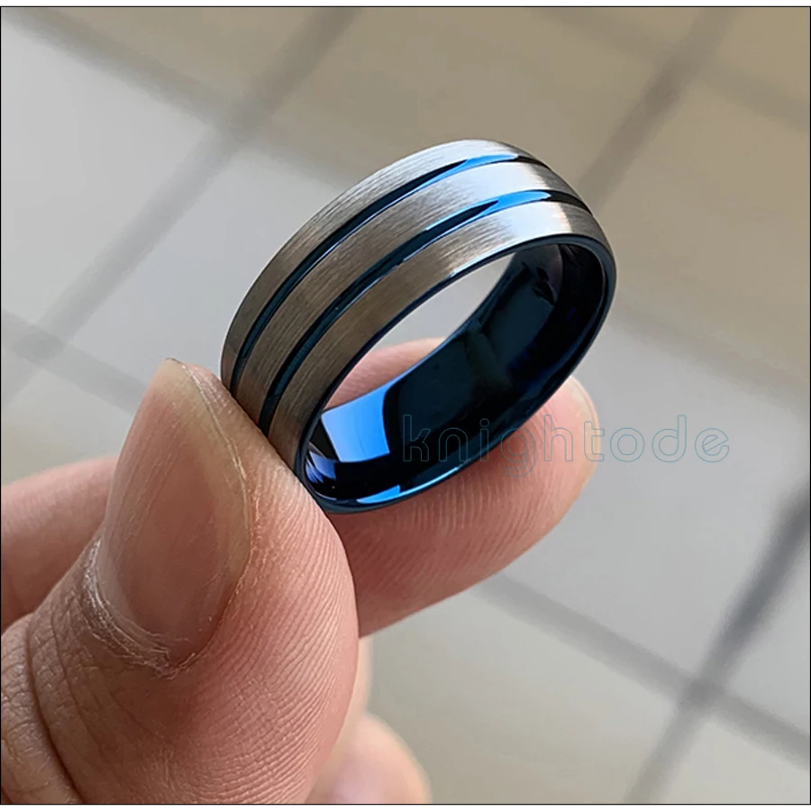 8mm Blue Two Grooved Tungsten Rings Domed Brushed