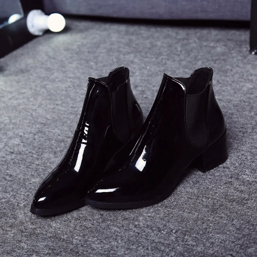 Модные женские эластичные ботинки из лакированной кожи; ботинки на низком каблуке с острым носком