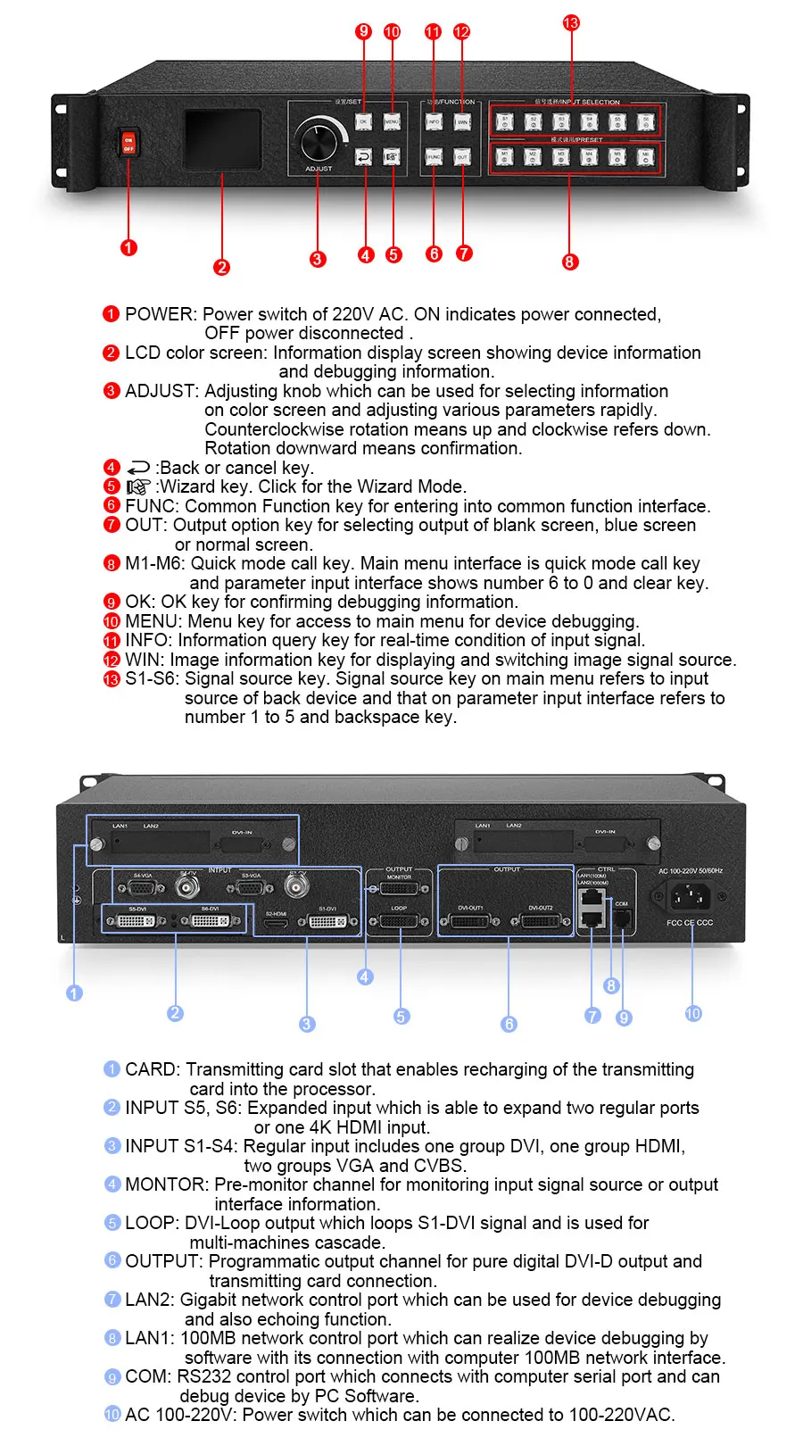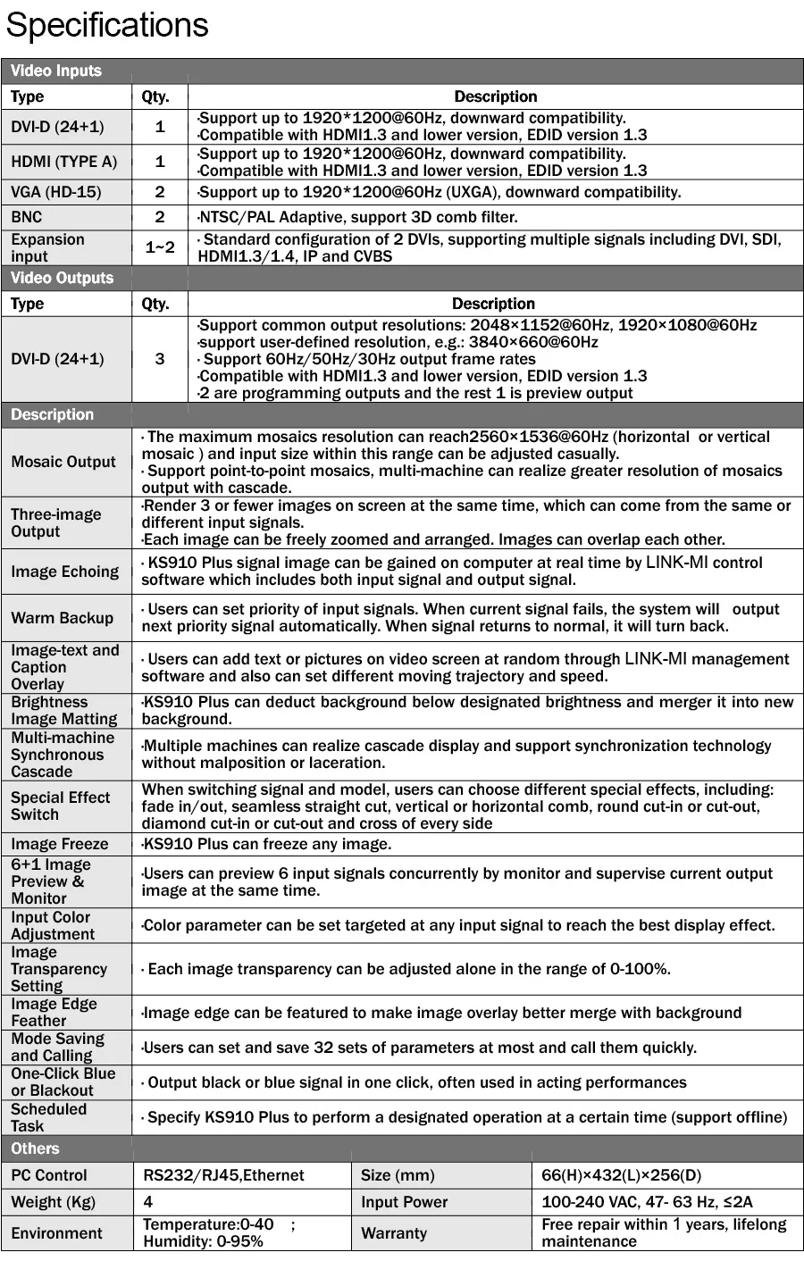 1. Support various signal input includes conventional DVI, VGA, HDMI, CVBS, SDI and IP;