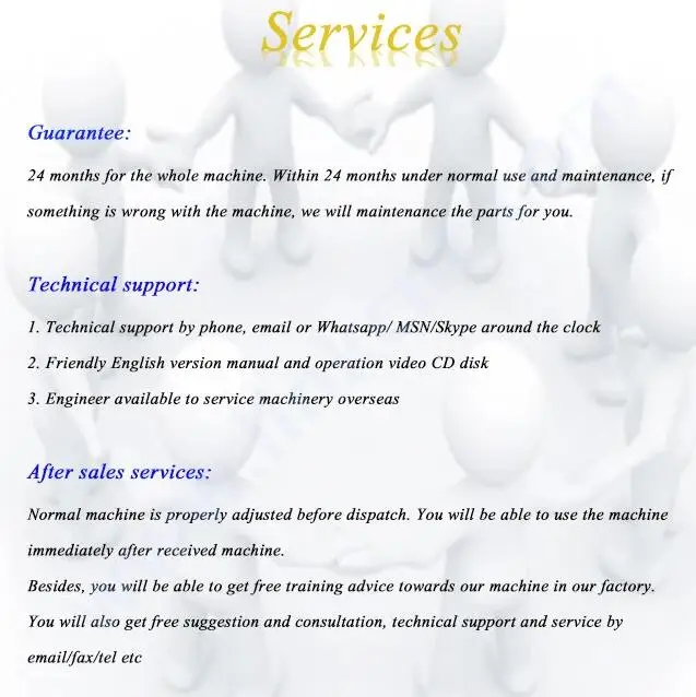 1) это первый раз, когда я использую этот вид машины, она проста в эксплуатации? ЕстьНаправляющее видеоЧто показывает, как использовать машину иИнструкция на английском языкеОтправьте вам с помощью машины. Если все еще есть какие-либо вопросы, мыПредоставьте бесплатное профессиональное руководство для вас, пока вы не сможете хорошо использовать машину. 2) Если машина имеет какие-либо проблемы после того, как я заказал его, как я могу сделать? Бесплатные детали отправляются вам в течение гарантийного срока, если машина имеет какие-либо проблемы. Бесплатное послепродажное обслуживание для машины, пожалуйста, свяжитесь с нами, если у вашей машины есть какие-либо проблемы. 3) Минимальный заказ? НашиМинимальный заказ 1 комплект машины. Мы можем отправить машину непосредственно в порт вашей страны, пожалуйста, сообщите нам ваше имя порта. Будет лучшая доставка грузов и машинная цена, отправленная вам. |