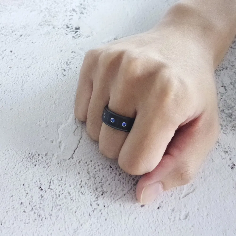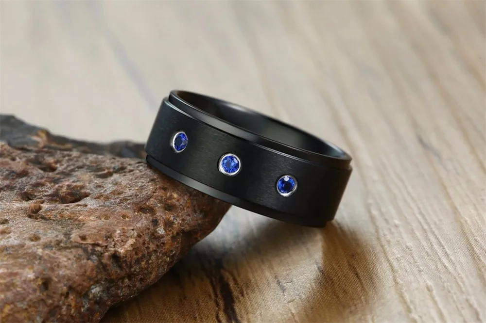Идеально подходит для свадьбы, помолвки, юбилея, возвращения домой, Дня благодарения, Рождества, Дня Святого Валентина, свидания, банкета, церкви, ужина, коктейля, вечера. Черная матовая отделка, три синие кубические инкрустация цирконием на финише, полированные ступенчатые края. Подлинная нержавеющая сталь, прочная и устойчивая к царапинам.