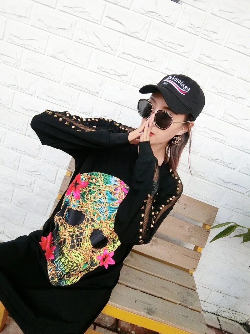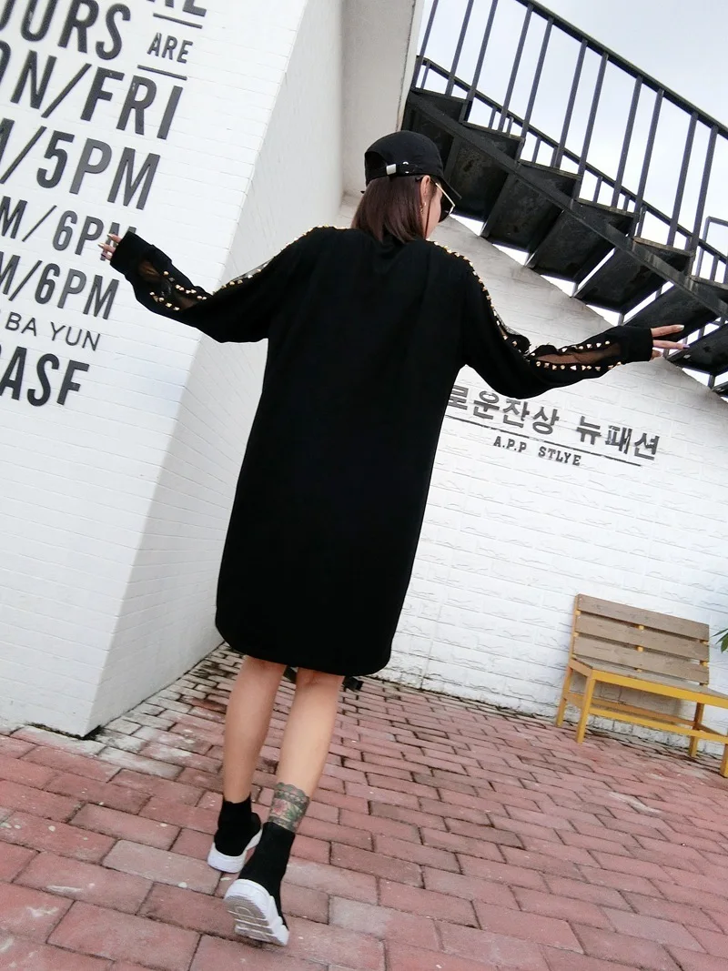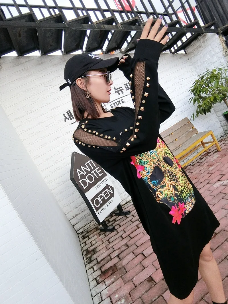QING MO женское платье-свитер с рисунком черепа, свободное платье с рукавами и заклепками, 2021 весеннее женское черное платье DQ0003A