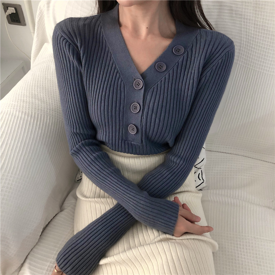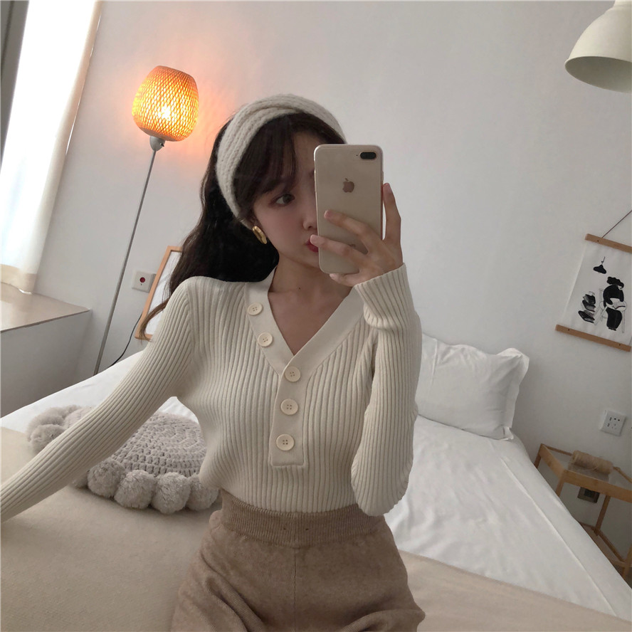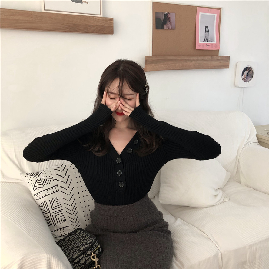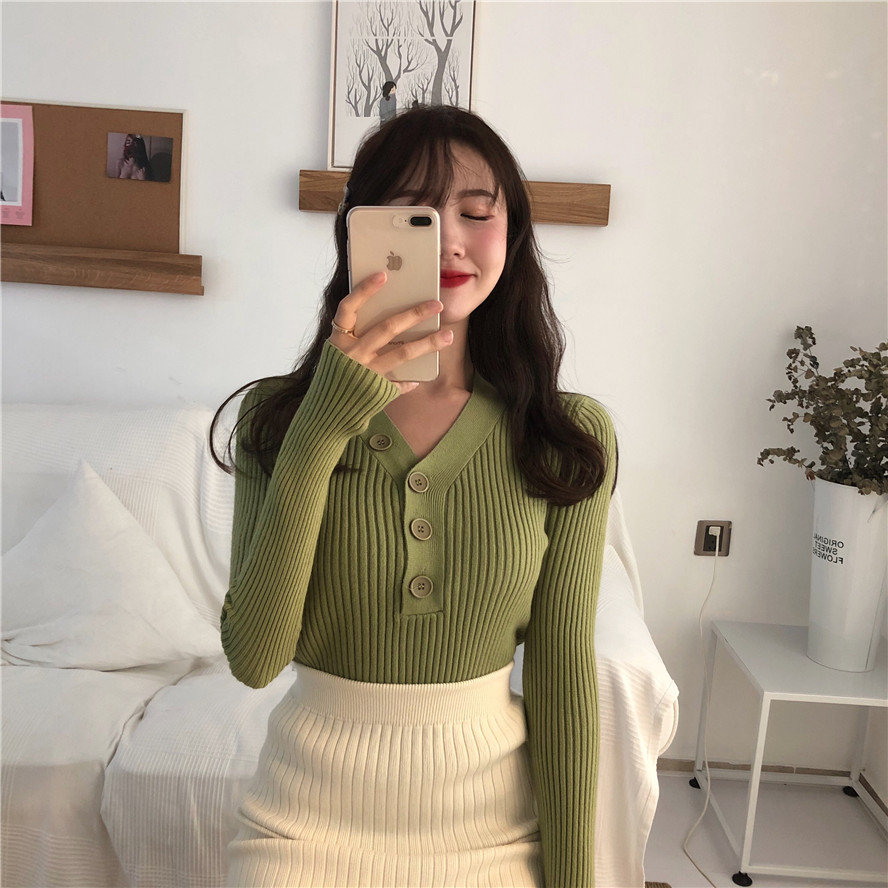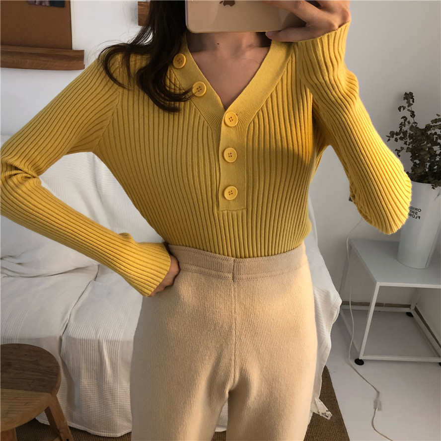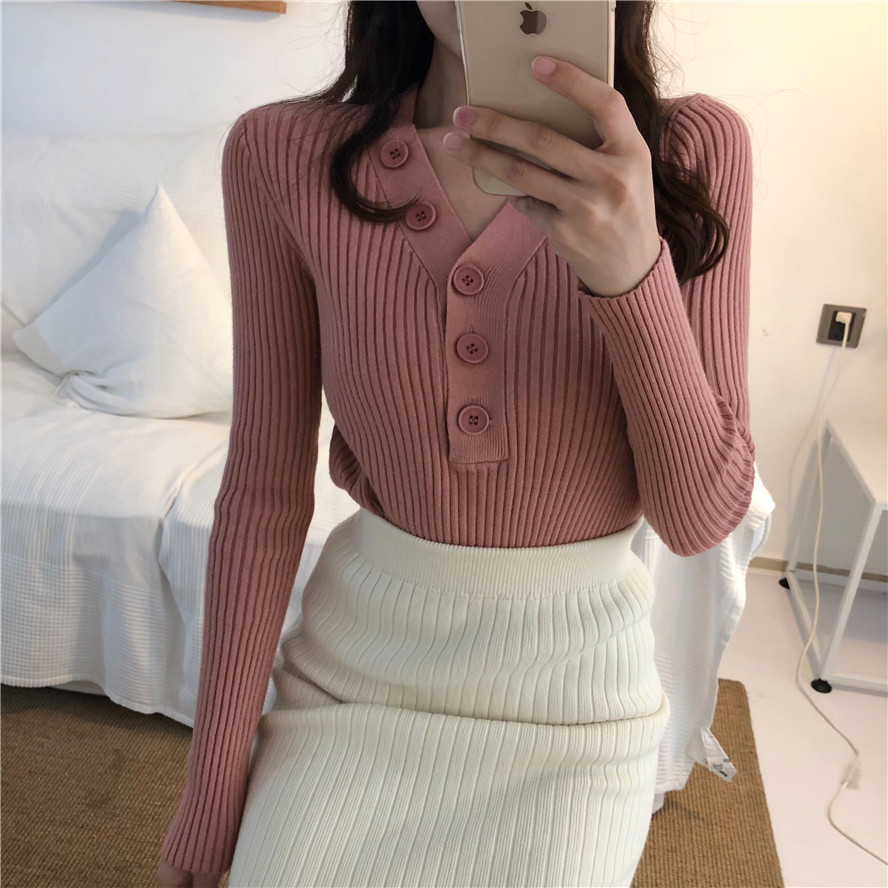 10 цвета осень 2018 г. и зима корейский шик стиль сплошной цвет v образным вырезом свитер тонкий вязаный Топы корректирующие женские