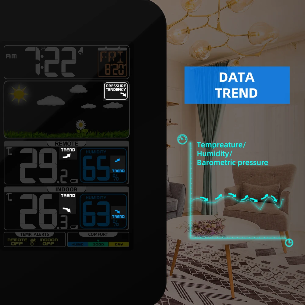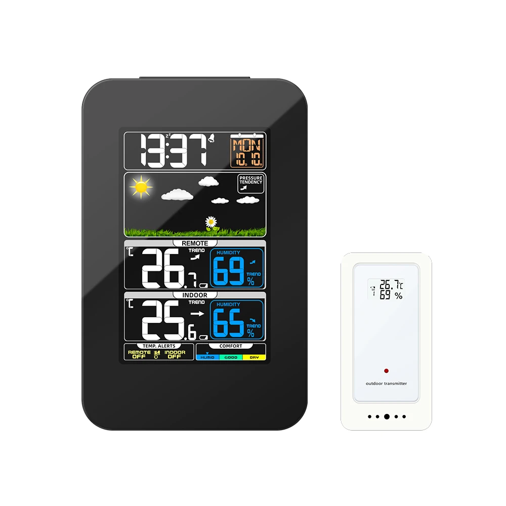 Большой цветной ЖК-экран с большими цифрами отображает пять значков погоды-солнечный, легкий, облачный, дождь и шторм, благодаря сенсорному дисплею с подсветкой Вы сможете легко читать в условиях тусклой освещенности.