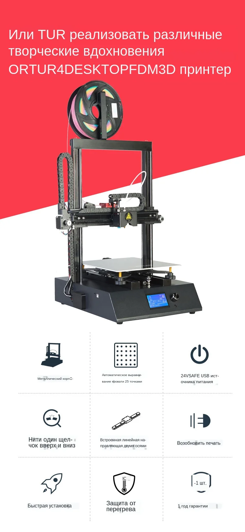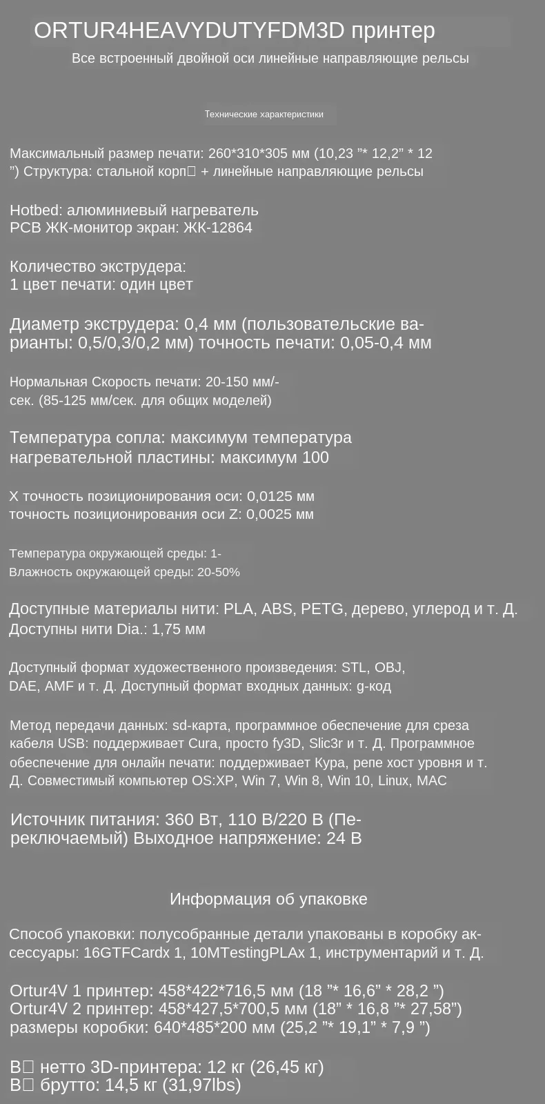 Максимальный размер печати:260*310*305 мм (10,23 "* 12,2" * 12 ") Материал оправы: стальной корпус + промышленная линейная направляющая ЖК-экран: LCD12864 Количество экструдера: 1 Диаметр экструдера. : 0,4 мм (пользовательские варианты: 0,5/0,3/0,2 мм) Разрешение слоя: 0,1 мм Нормальная Скорость печати: 100-150 мм/сек. (При простой форме поверните по часовой стрелке 100-300% для ускорения.) Температура сопла: максимум 275 ℃ Температура нагрева: максимум 100 ℃ Источник питания: 360 Вт, 110 В/220 В (Переключаемый) Размеры 3D-принтера: 450x420x710мм (17,72 "* 16,54" * 27,95 ") Размеры коробки: 580*460*290 мм (22,83 "* 18,11" * 11,42 ") Вес брутто: 12,9 кг Особенности:1.Прочная металлическая рама: Принимает профессиональную структуру листового металла, уменьшает резонанс и поддерживает высокую точность.