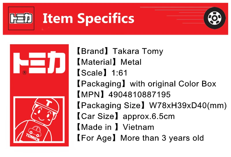 Номер товара. : 4904810887195 Производитель: TAKARATOMY Бренд: Tomica Размер посылка: W78 x H41 x D39 мм Целевой возраст: 6 лет ~