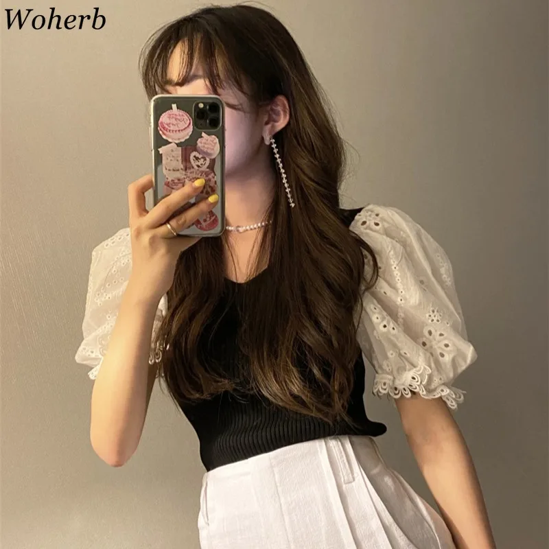 Woherb женские топы, Корейская одежда, винтажные блузки с v-образным вырезом и пышными рукавами, Ажурные кружевные трикотажные рубашки с вышивкой, Лоскутная Блузка
