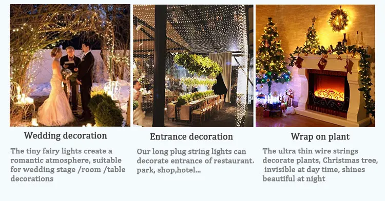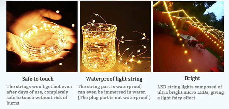 Цвет провода: медный или серебристый цвет освещения: теплый белый, холодный белый, многоцветный Количество СВЕТОДИОДНЫЙ: 10 м 100 светодиодный, 20 м 200 светодиодов, 30 м 300 светодиодов, 50 м 500LED, 100 м 1000LED Кабель питания: от вилки до первого светодиодный: 2 метра Входное напряжение: AC100-240V, штепсельная вилка США/Великобритании/Австралии/ЕС для опции, пожалуйста, оставьте сообщение Выходное напряжение: 10 м DC5V, 20 м DC5V, 30 м DC12V, 50 м DC15V, 100 м DC30V Водонепроницаемый: адаптер IP44, струнные огни IP65 Сертификация: CE RoHS FCC