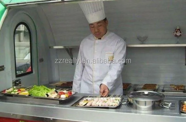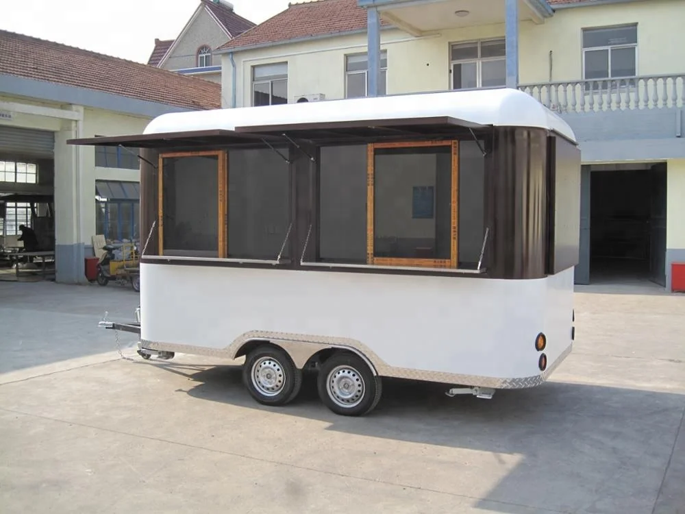Body | Fiberglass shell, the middle layer is thermal isolation,veneer board and the internal wall is aluminum composite panel of High quality. a Service window in the front, one Ventilation Outlet and one door, stainless steel countertops, completed water system. |