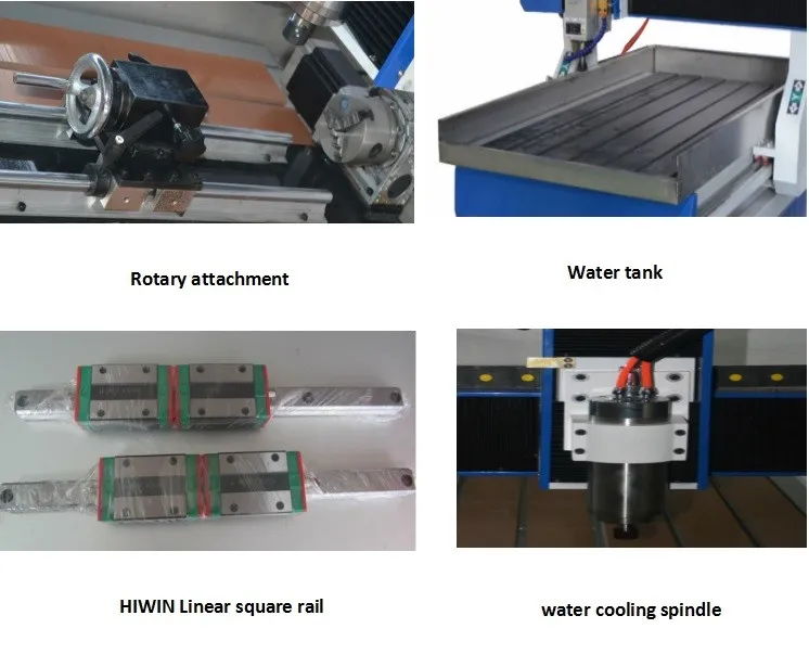 Дополнительные детали | 1.Hiwin Линейный Квадратный направляющий рельс 2. Нержавеющий резервуар для воды 3. Поворотная ось для гравировки круглого дерева: цена зависит от его диаметра 4.2.2 кВт шпиндель водяного охлаждения |