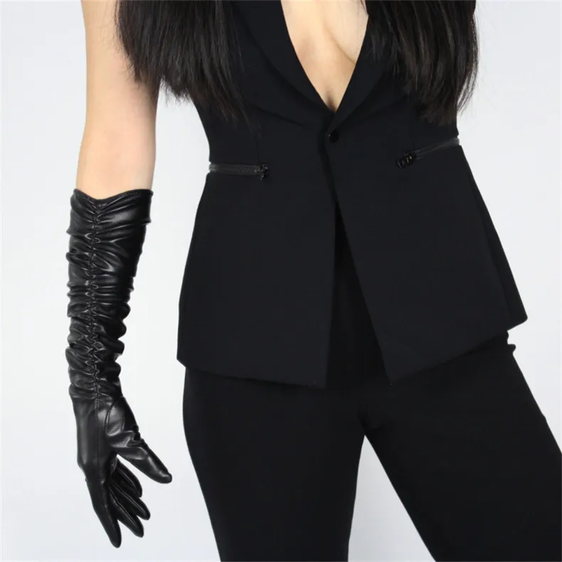 Длинные перчатки для сенсорного экрана, женские кожаные перчатки из искусственной кожи, плиссированные, черные, с шелковой подкладкой, женские перчатки, 40-50 см, WPU81