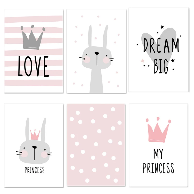 Розовый мультфильм детская СТЕНА картина плакат и печать Корона кролик детская комната для девочек современный холст живопись Дети Спальня украшение