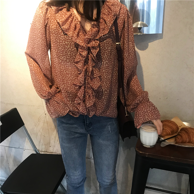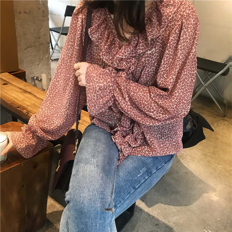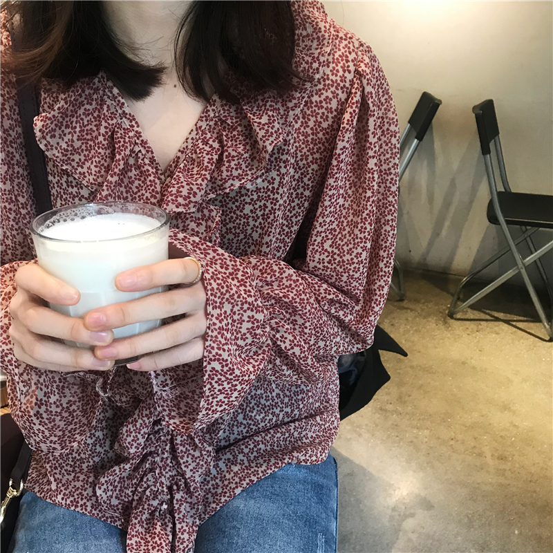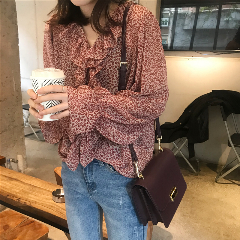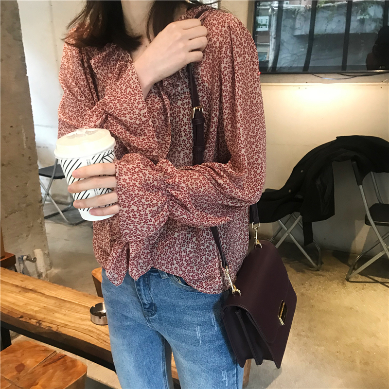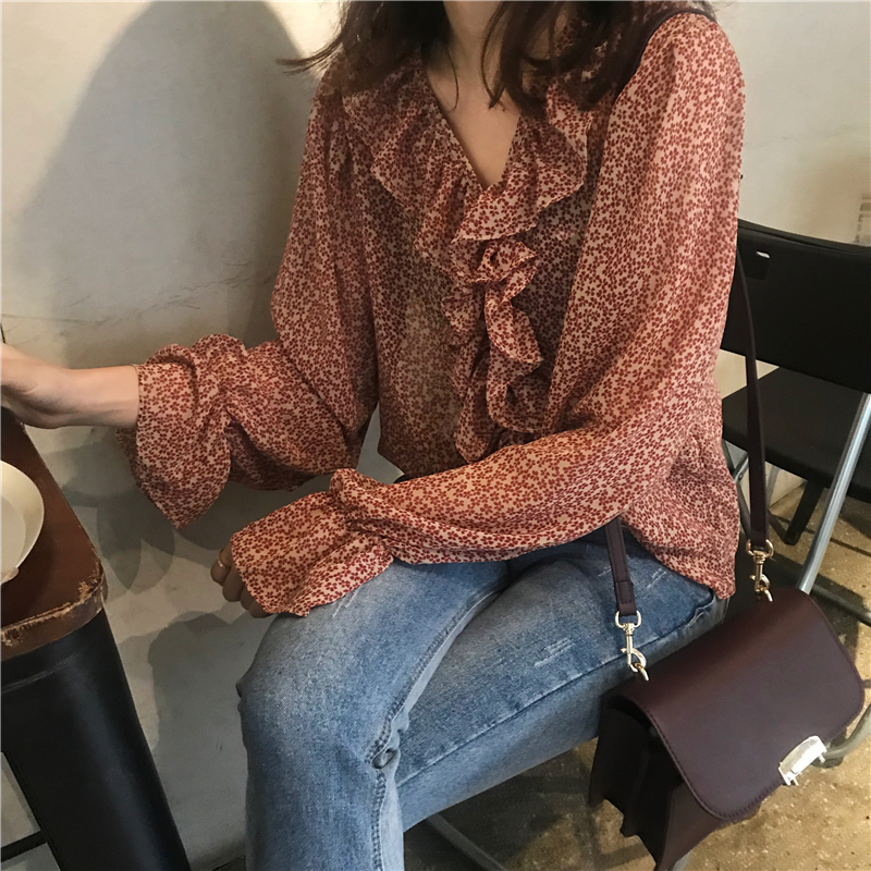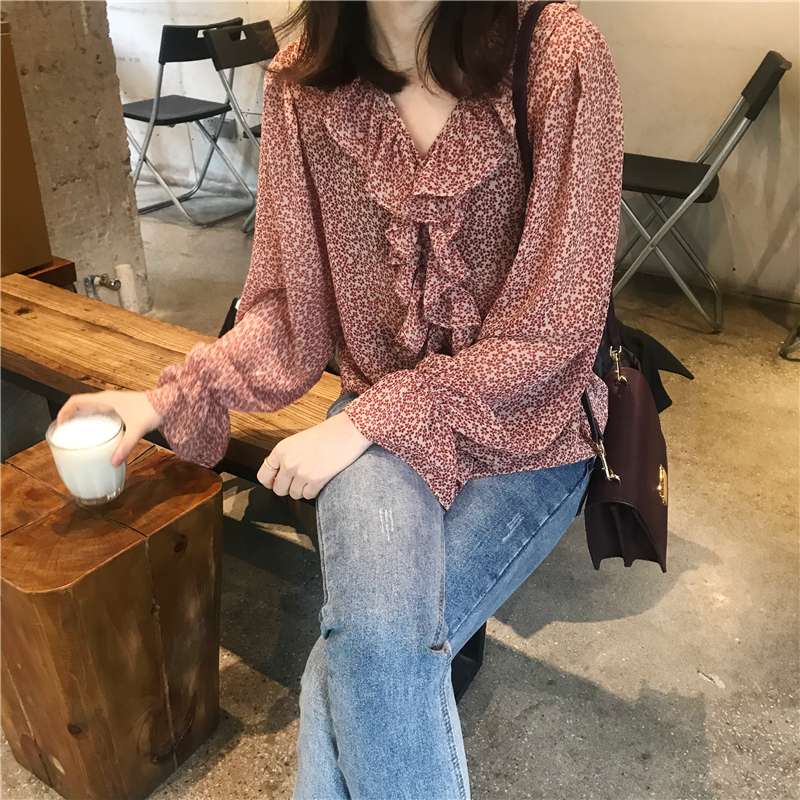 2019 весенние и осенние Милые шифоновые рубашки женские блузки с длинным рукавом и v-образным вырезом женские
