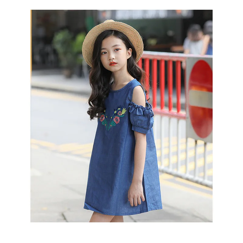 Джинсовое платье для больших девочек, летние детские платья с цветочной вышивкой, одежда для девочек-подростков, одежда для детей 4, 6, 8, 10, 12, 14 лет, 2019