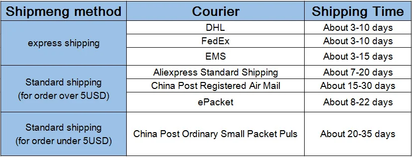 A:Обычно мы отправляем товар по Почта Китая, обычно вы получаете товарВ течение 45 дней.