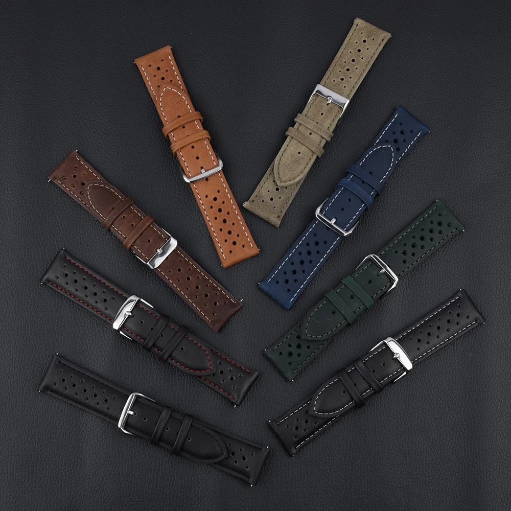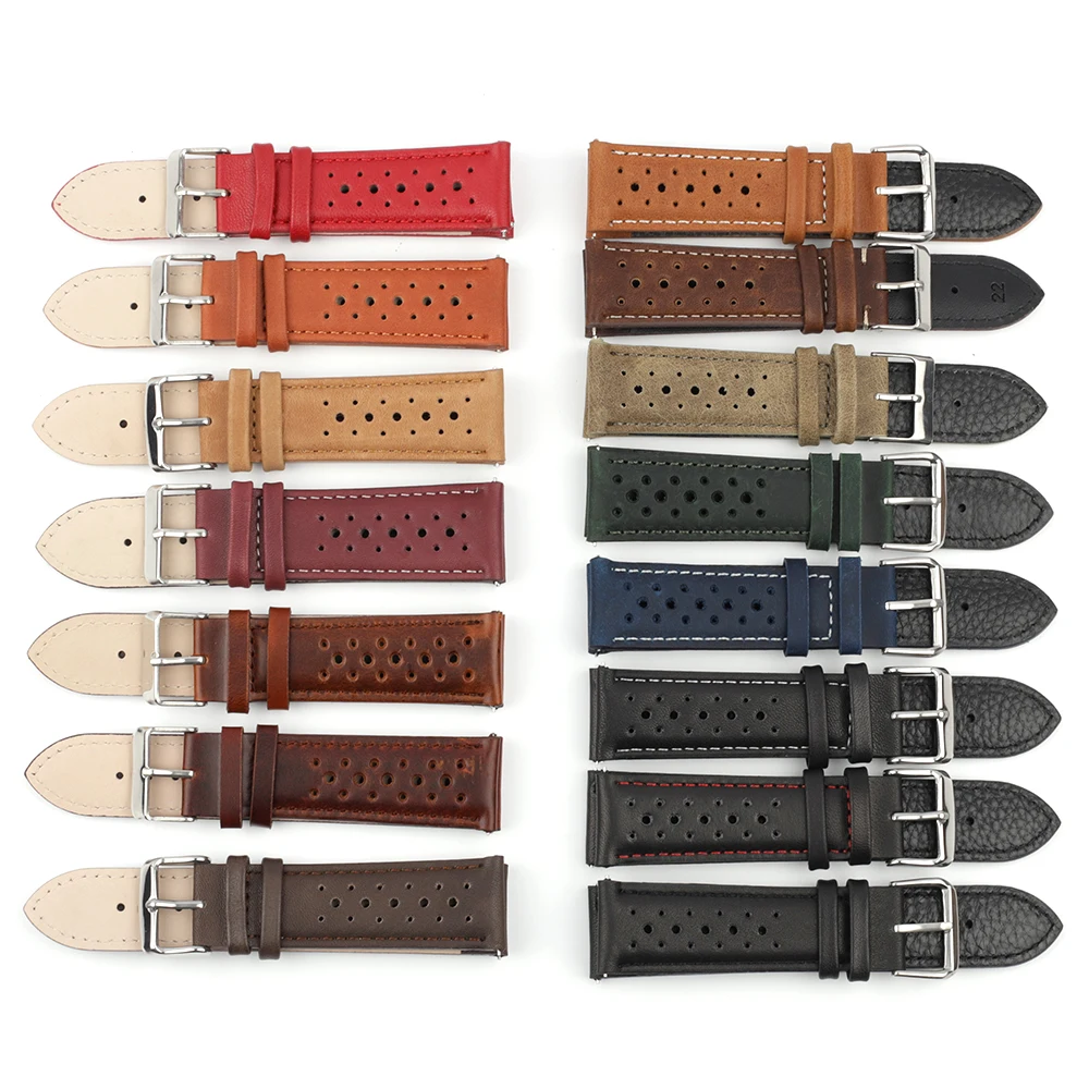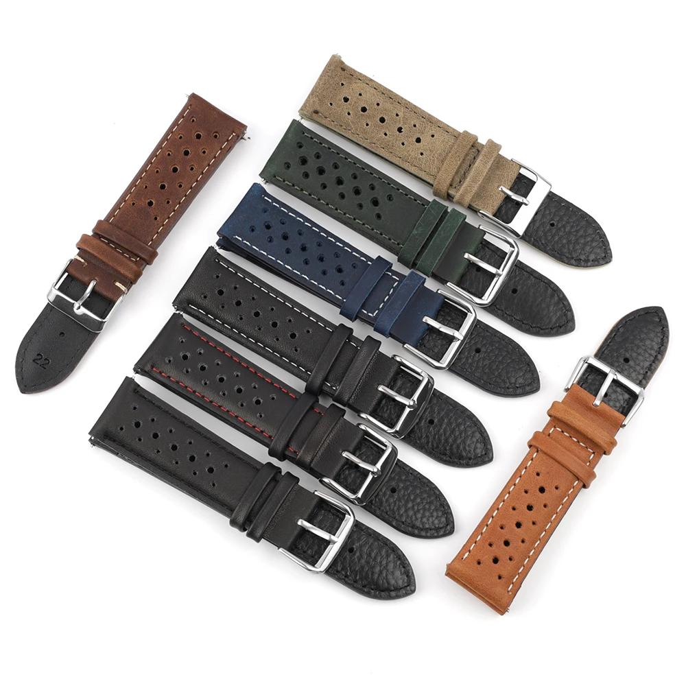 Мягкий ремешок для часов из натуральной кожи, 18 мм, 20 мм, 22 мм, 24 мм, дышащий пористый браслет, черный браслет для часов, ручной работы, ремешок для часов