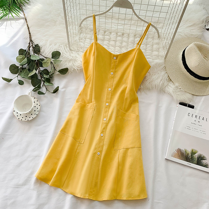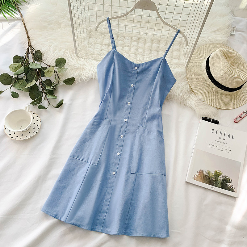 Новинка 2020, летнее женское платье без рукавов с v-образным вырезом на тонких бретелях, однобортное платье трапециевидной формы из хлопка и льна, Vestidos Mujer