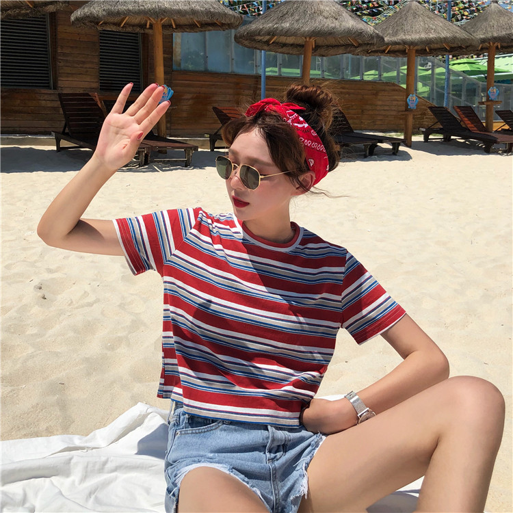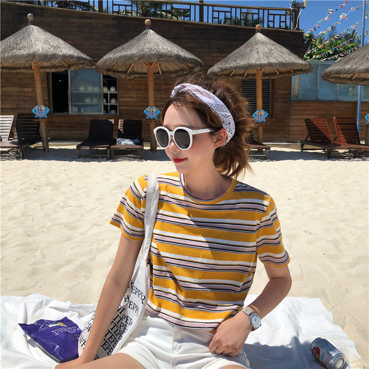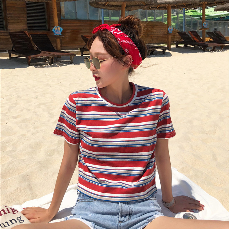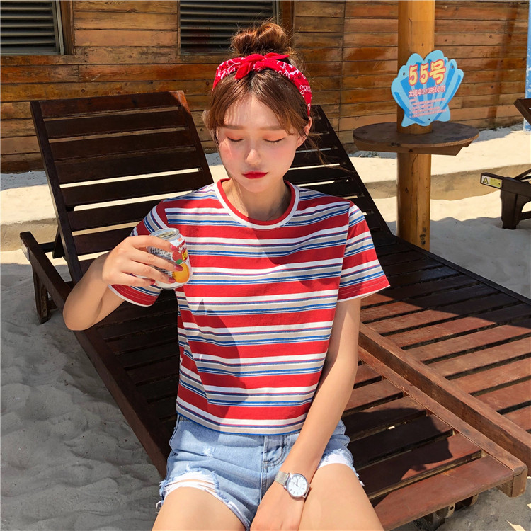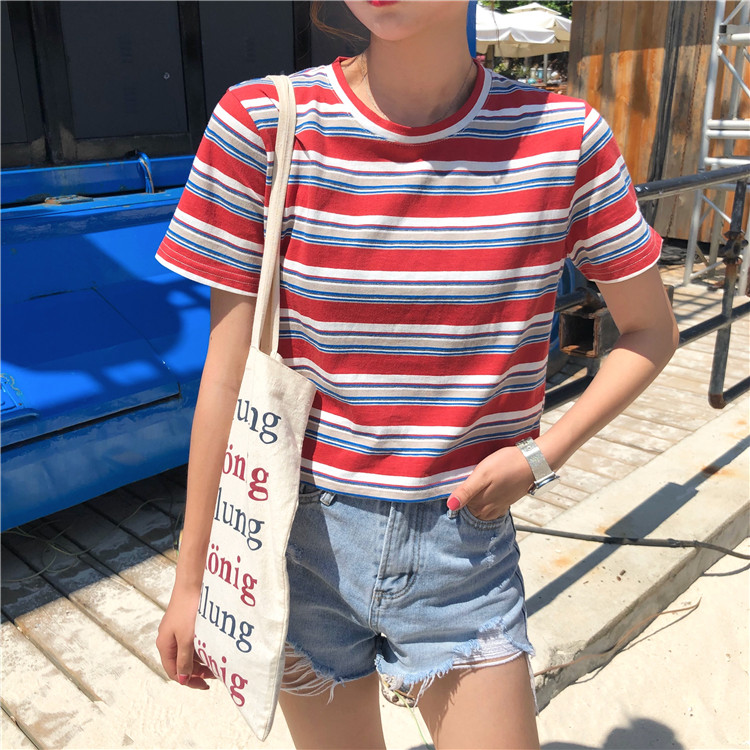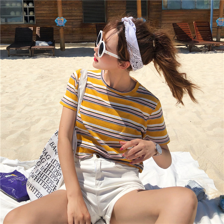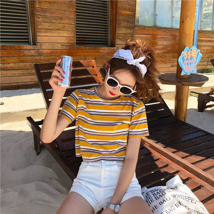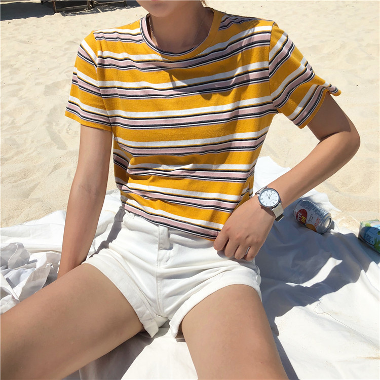6 цветов 2019 Лето корейский стиль свободные красочные полосатые футболки с коротким рукавом женские топы футболки femme