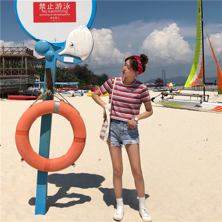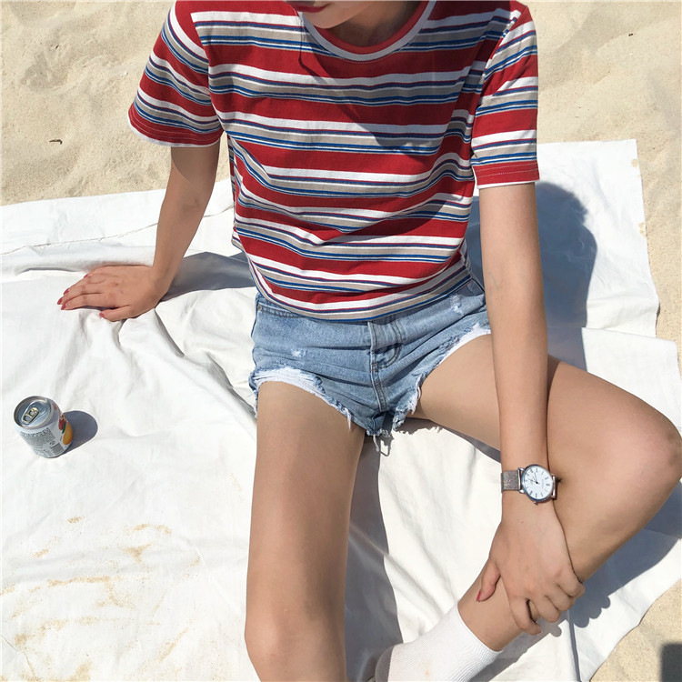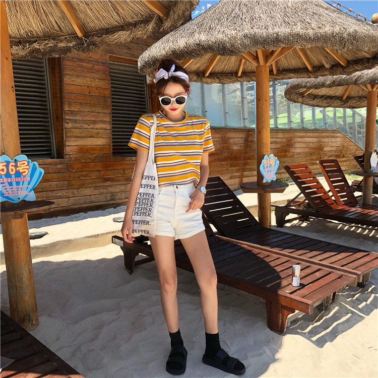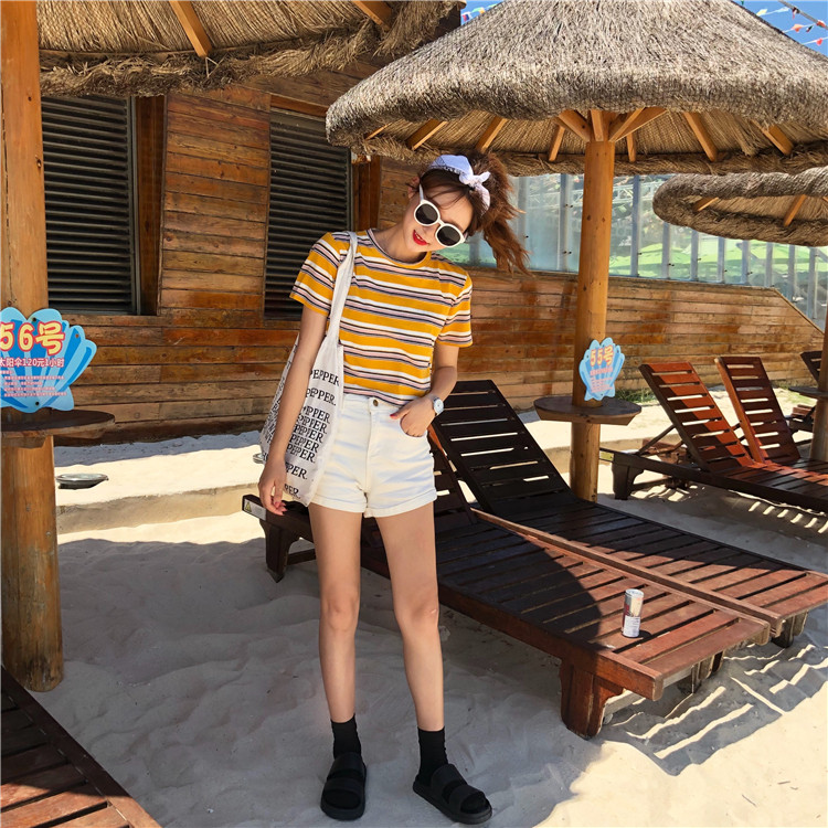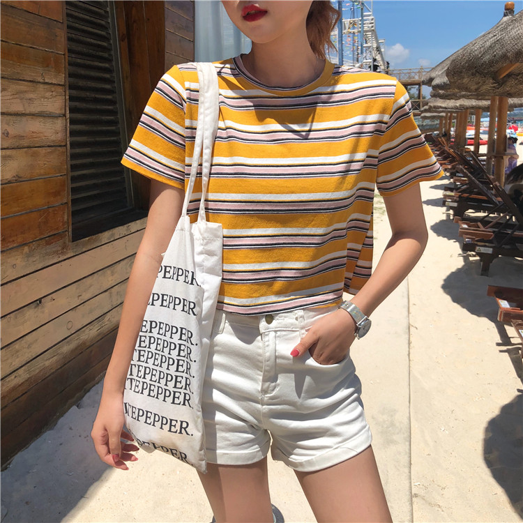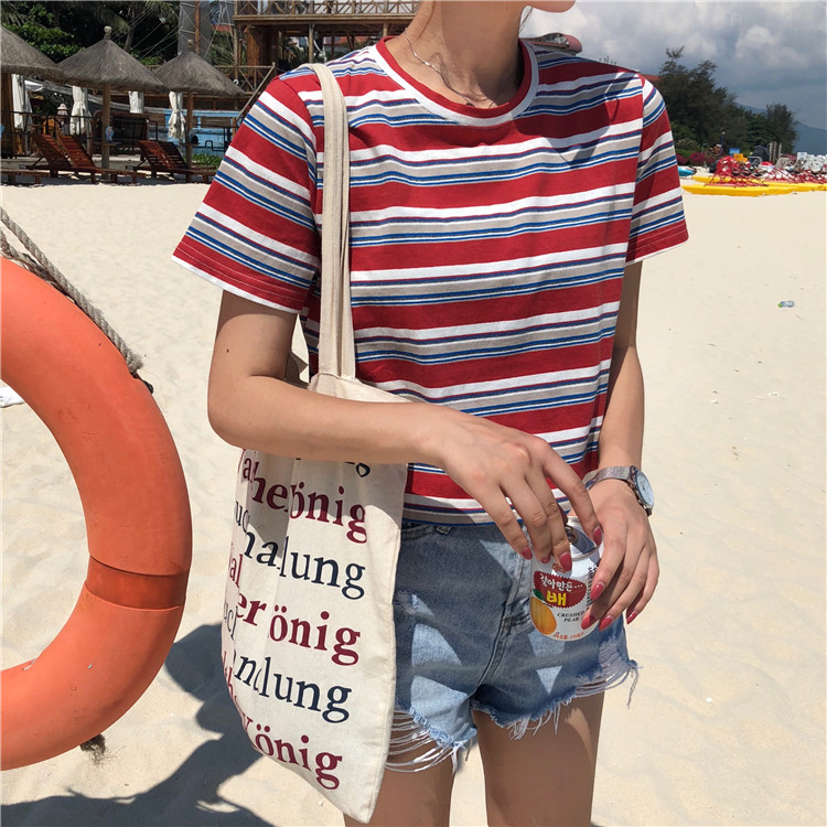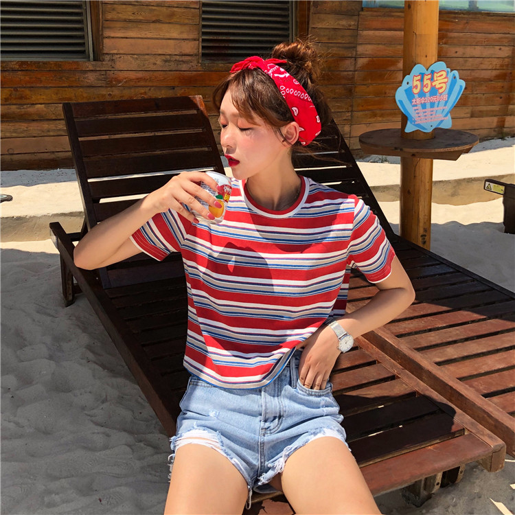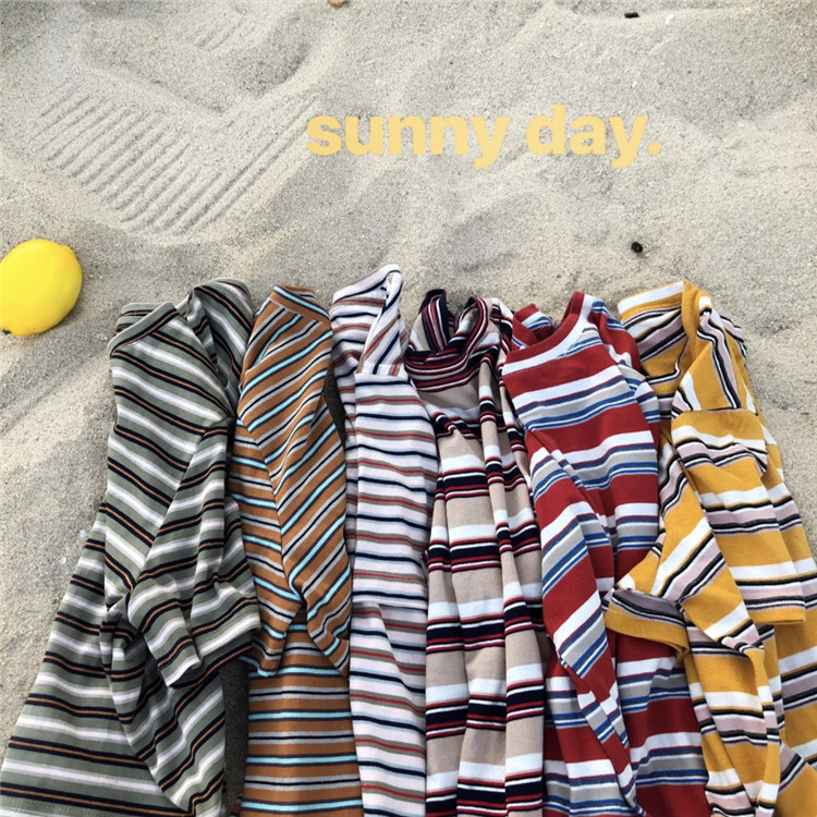 6 цветов 2019 Лето корейский стиль свободные красочные полосатые футболки с коротким рукавом женские топы футболки femme