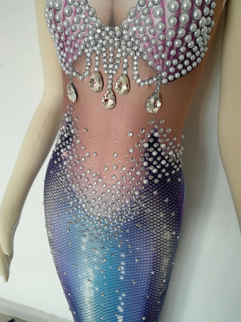 Christia Bella Sexy Pearls Rhinestones Mermaid Long Dress Party Women Sexy Trailing Dress Evening Dress Singer Stage Costumes