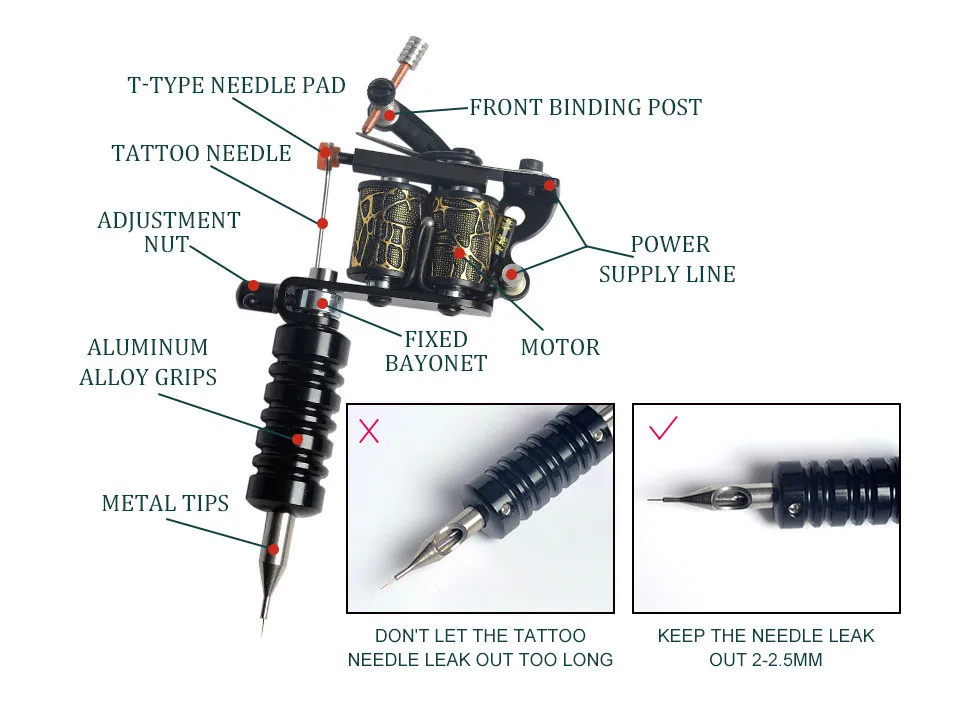 5. С помощью резиновой ленты перекрестите татуировочный пистолет и иглу, чтобы избежать поворота иглы