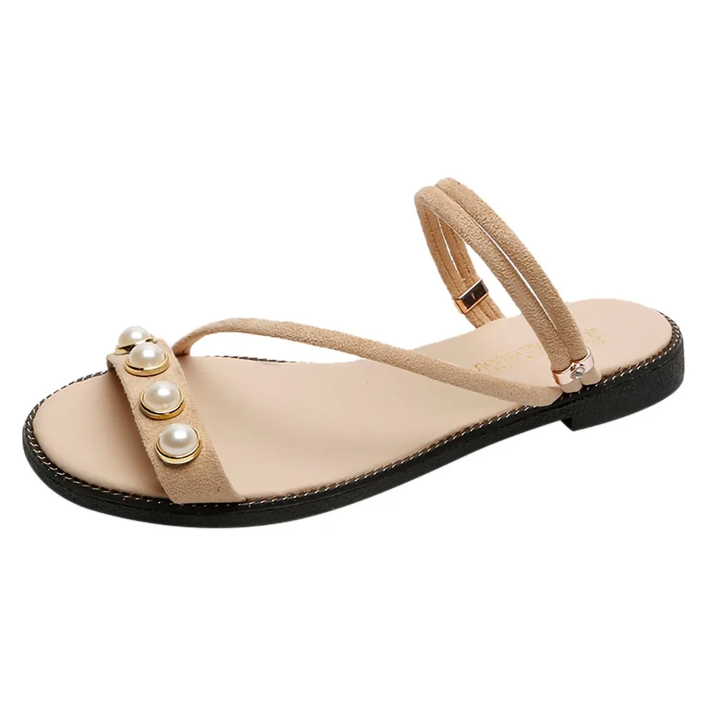 Женская пляжная прогулочная обувь на плоской подошве с открытым носком и жемчугом; сандалии в богемном стиле; шлепанцы