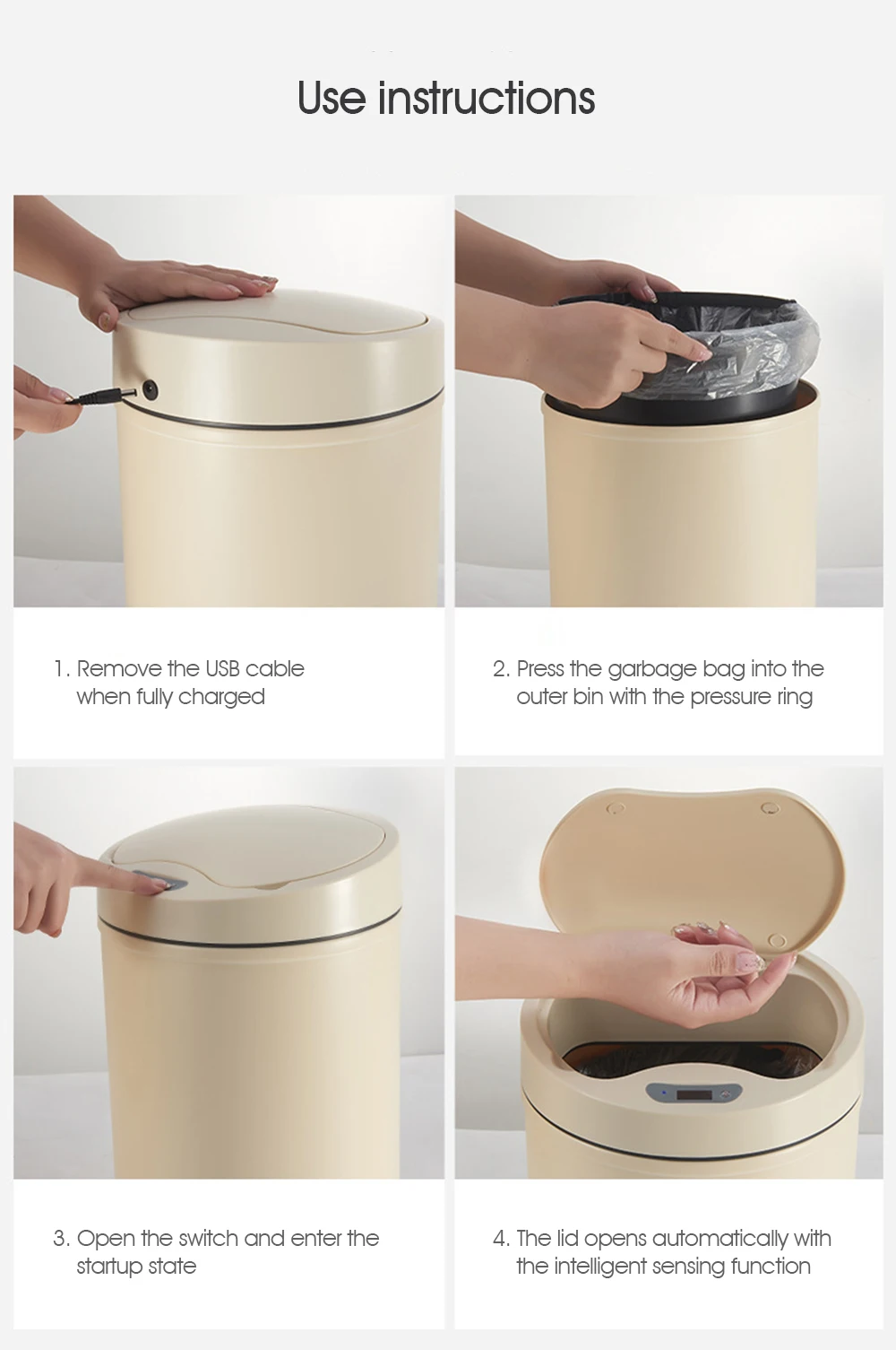ЭтоАвтоматическая Сенсор умная мусорная корзинаПредназначен для того, чтобы сделать жизнь более удобной. С функцией интеллектуального зондирования, его можно легко использовать и дать вам новый опыт. Как только вы помахнете рукой над верхней частью крышки, она почувствует и раскроет крышку. Идеально подходит для дома, офиса и т. д.