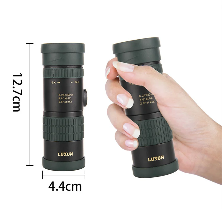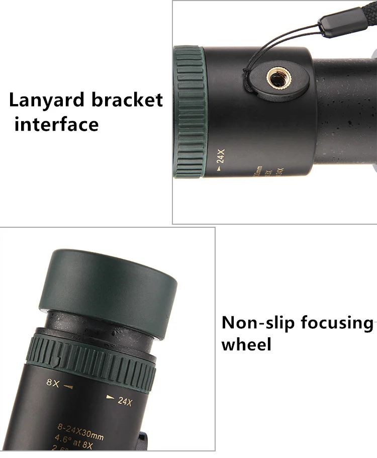 Модель: 8-24X30 Увеличение: 8-24 раза, 8-24 раза можно произвольно отрегулировать в соответствии с потребностями Калибр окуляра: 15 мм Диаметр объектива: 30 мм Полный комплект телескопа Вес: 220 г Телескоп + зажим для телефона + штатив Полный комплект Вес: 312 г Призма Категория: bk4 Покрытие: многослойная широкополосная зеленая пленка Размер: самый короткий размер: 126 мм × 42 мм; Самый длинный размер: 172 мм × 31 мм Угол обзора: 8 раз: 4,6 ° ~ 30 раз: 2,6 ° Метод фокусировки: растяжение или вращение фокуса (два способа) Полный набор аксессуаров: коробка с карманами, зеркальная ткань, брошюра, Треугольный Кронштейн, папка для телефона