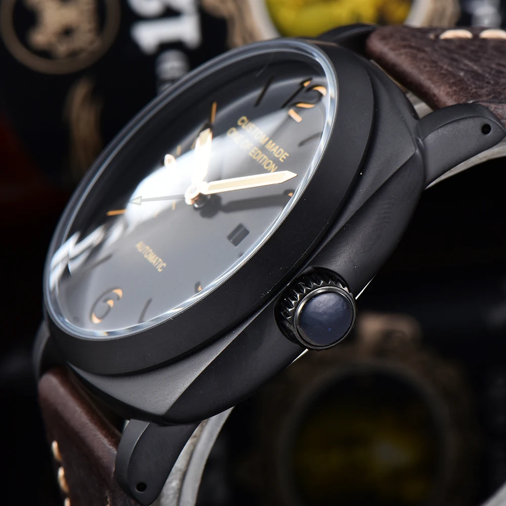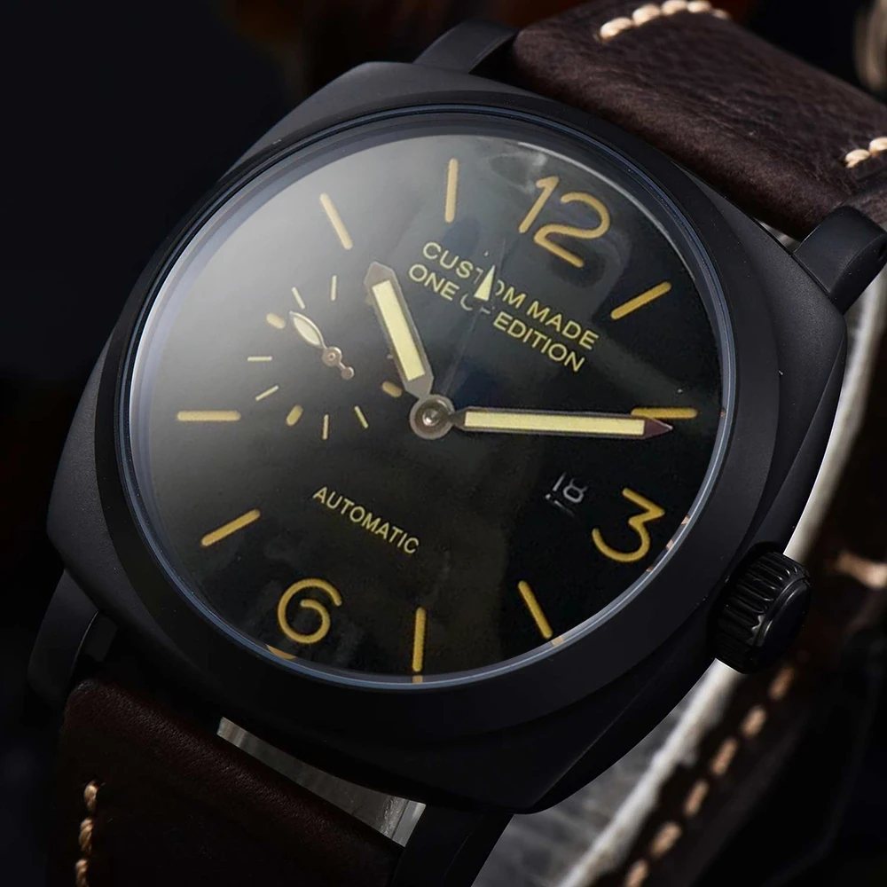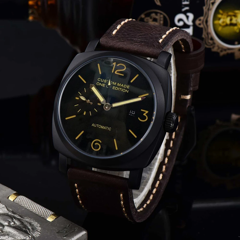 47 мм PVD Черный корпус из нержавеющей стали часы автоматическое движение GMT указатель может работать световой ручной кожаный ремешок 54-3