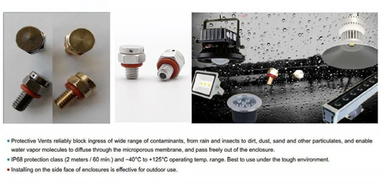 «Винт-в вентиляционное отверстие дизайн для вентиляции воздуха и предотвращения воды Корпуса. Благодаря отличной проницаемости, винт в вентиляционных отверстиях балансирует Разница в воздушном давлении внутри корпуса и окружающей среды Состояние и низкое давление на уплотнительные прокладки, поэтому он продлевает Уплотнительные прокладки срок службы и повышение надежности Устройства. Микропорная мембранная структура ePTFE build-in Screw-in Vent Обеспечивает эффективный барьер от пыли и грязи и все еще позволяет Продукт для того чтобы дышать с изменяя условиями окружающей среды. Этот Предотвращает давление от создания и повреждения уплотнений корпуса, Подвергая чувствительные компоненты воздействию воды и мусора. Оборудование, используемое в отрасли связи, подвергается Быстрые колебания температуры, различные частицы, и Воздействие ветра, осадков и солнечного излучения. Винт в Vent Вентиляционные отверстия эффективно защищают их от негативного воздействия Перепады давления, вызванные изменением температуры, и обеспечивают Эффективный барьер против пыли, воды, солей и других коррозионных веществ Жидкостей. Особенно его Резьбовая конструкция обеспечивает безопасное механическое Крепление, его прочный дизайн держит его в состоянии использовать в чрезвычайно Суровые условия в поле. Его уникальное свойство делает его найти Широкое применение в судовой электросвязи и системе сигнализации ".