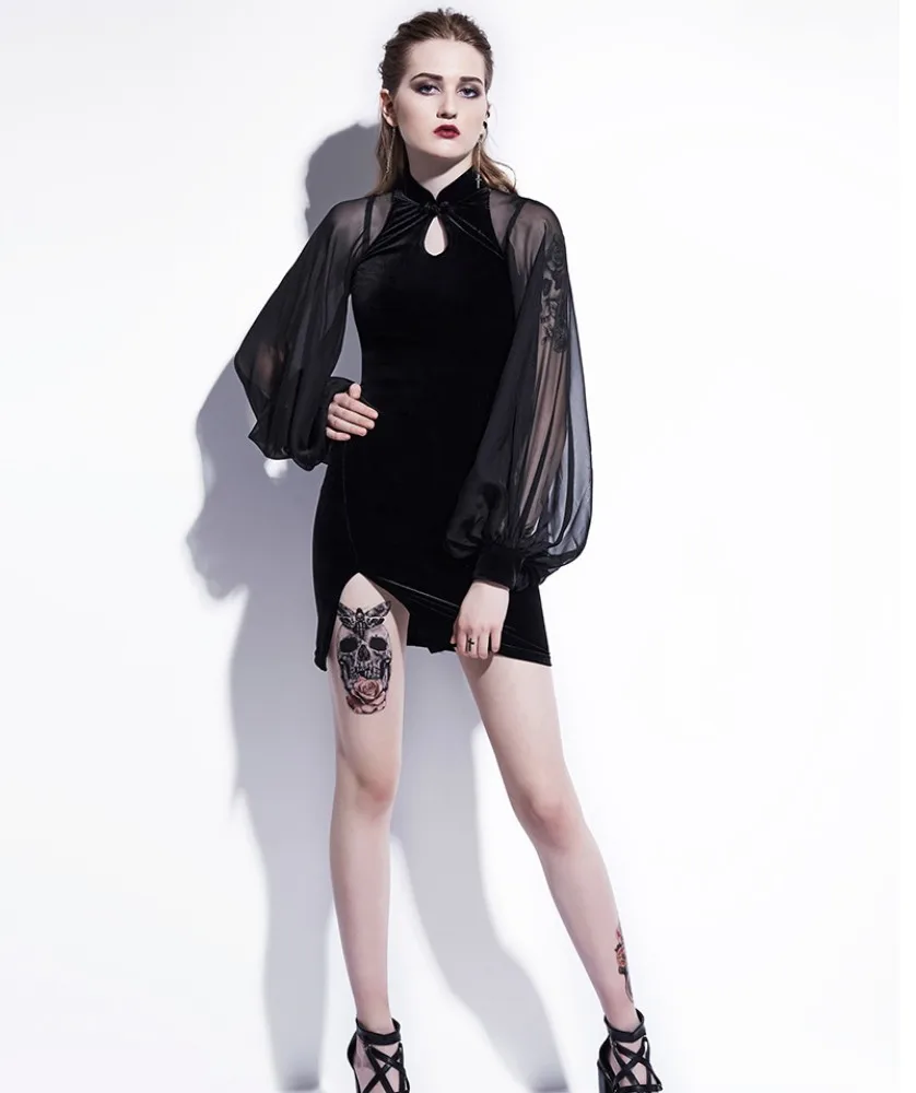 Puff Sleeve Black Patchwork Chiffon Women Dress
