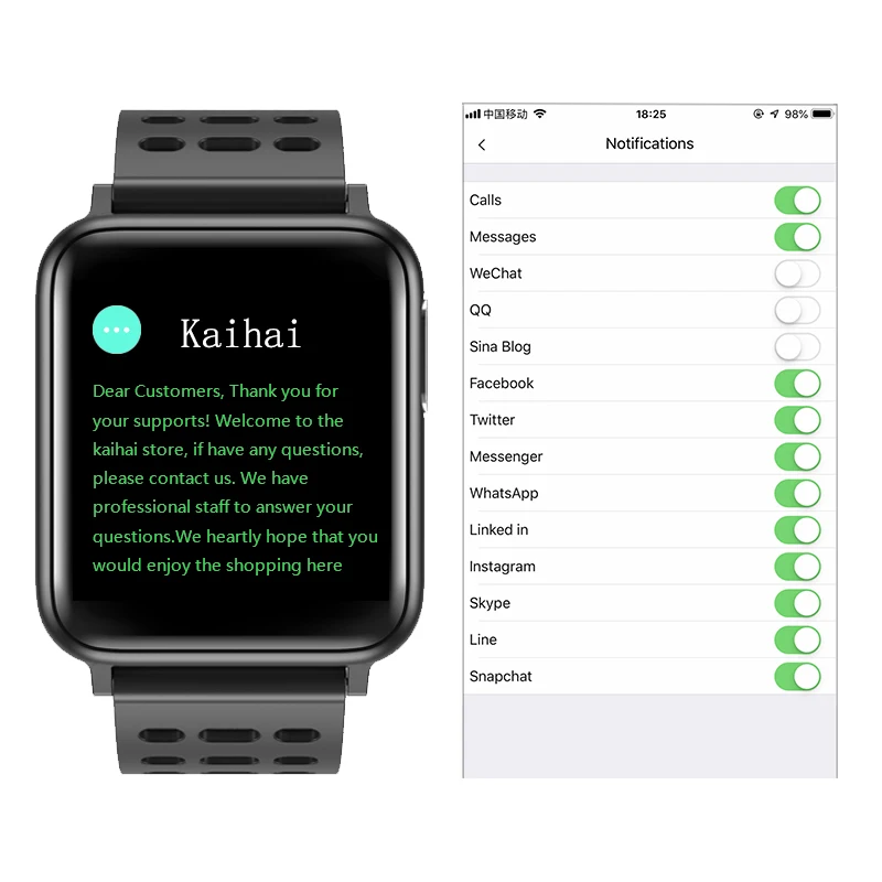 Монитор сердечного ритма Кровяное давление (не поддерживает более 150 артериального давления) Для отображения данных по содержанию кислорода в крови Погодных условий PPG + ЭКГ монитор Расстояние Калорий Сон (перед сном, смарт-браслеты и меха должны обновить данные синхронизации.) Run Езды на велосипеде Идентификатор звонящего (необходимо установить на приложение и мобильный телефон) SMS напоминание (необходимо установить на приложение и мобильный телефон) Напоминание о приложении (whatsapp, Twitter, line, Facebook) (необходимо установить на приложение и мобильный телефон) Сидячий напоминание Сигналы напоминания и будильника Долгое нажатие, чтобы отклонить вызов Название приложения-"mecare" Пожалуйста, обратите внимание: Для телефона Android ОС должна быть 4,4 или выше и Bluetooth должна быть V4.0 или выше (не поддерживает samsung j1 и j3 Для телефона ios iOS должен быть 8,0 или выше, а Bluetooth должен быть V4.0 (поддержка ipone 5s или выше) 1: после загрузки приложения mecare, пожалуйста, обязательно Установите правильную информацию пользователя в приложении Mecare (возраст, пол, рост, вес), при измерении, если вы выходите или не можете измерить на браслете. Пожалуйста, измените цвет кожи в приложении 2. Когда вы открываете приложение MeCare на телефоне, вам нужно прокрутить вниз экран, чтобы увидеть все опции меню. 3. ECG начинается с приложения MeCare на вашем телефоне (не от KAIHAI H69). Прижмите палец к контакту на стороне KAIHAI H69, а затем начните ЭКГ из приложения MeCare. ЭКГ должен начать прокручиваться по экрану в приложении MeCare. Если ЭКГ не показывает хорошее чтение попробуйте настроить, как ваш палец нажимается на контакт на стороне KAIHAI H69, также попробуйте аккуратно нажать вниз на KAIHAI H69, чтобы улучшить соединение двух контактных точек под (против запястья) или установить восстановление заводских настроек в приложении