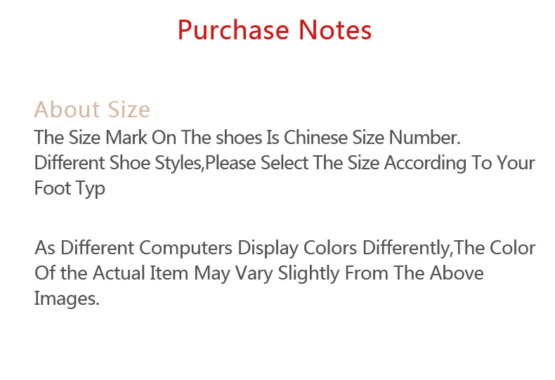 Обратите внимание: Размер, указанный на обуви, соответствует китайскому размеру.