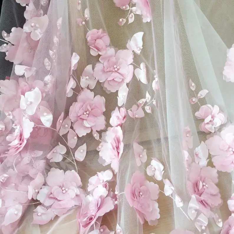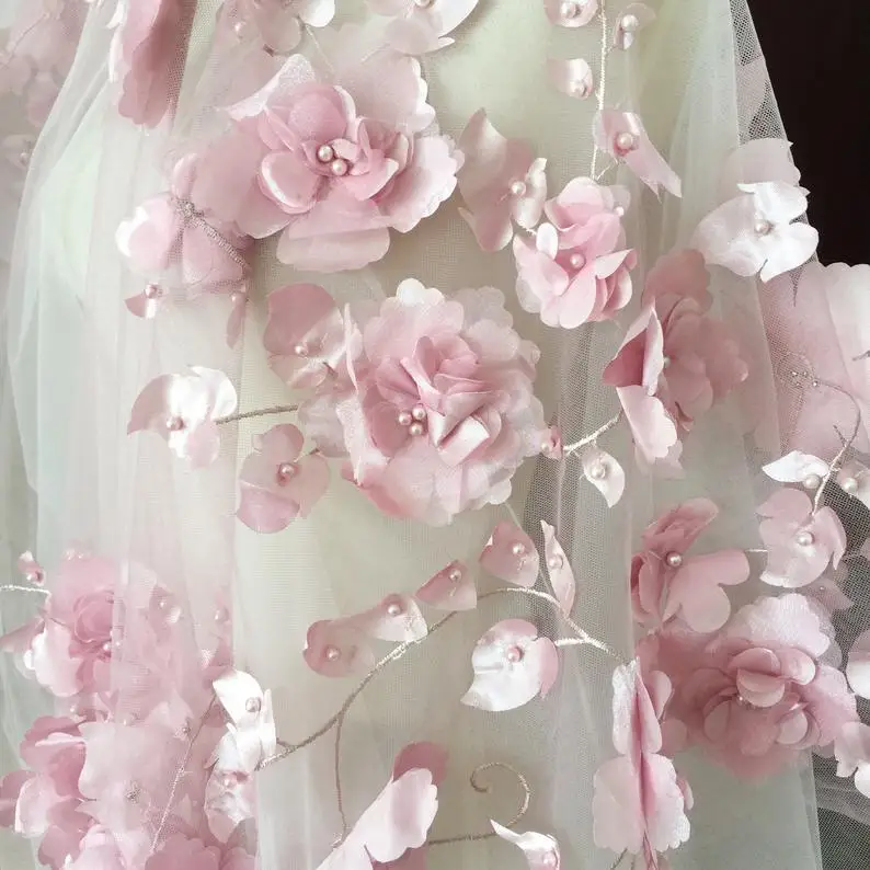 Пыльный розовый 3D жемчужный бисером кружевной ткани