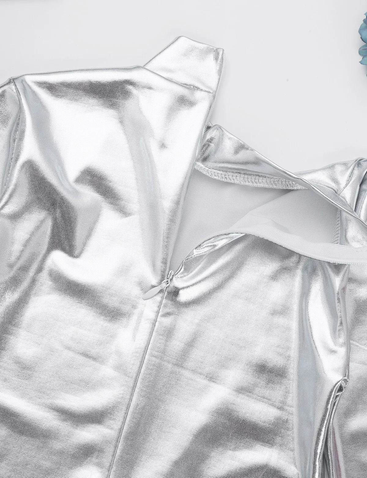 Длинные рукава с отверстием для большого пальца, водолазка. Скрытая молния сзади. Глянцевый внешний вид, однотонный.