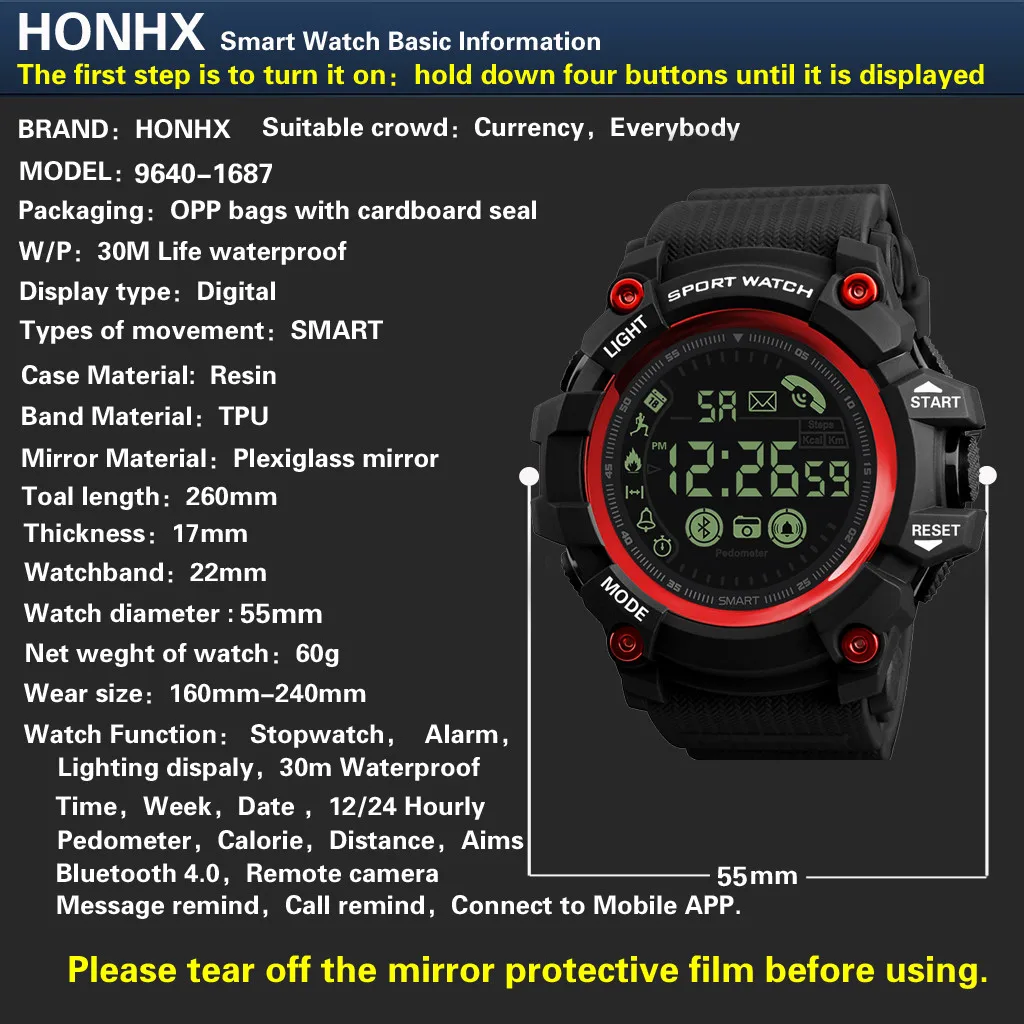Отображение времени, недели, даты, месяца,Muldfunctional sport, 12/24 ежечасный, Pedomter, калории, расстояние, aimes BLuetooth 4,0, удаленное сообщение камеры, напоминание о звонке, подключение к мобильному приложению.