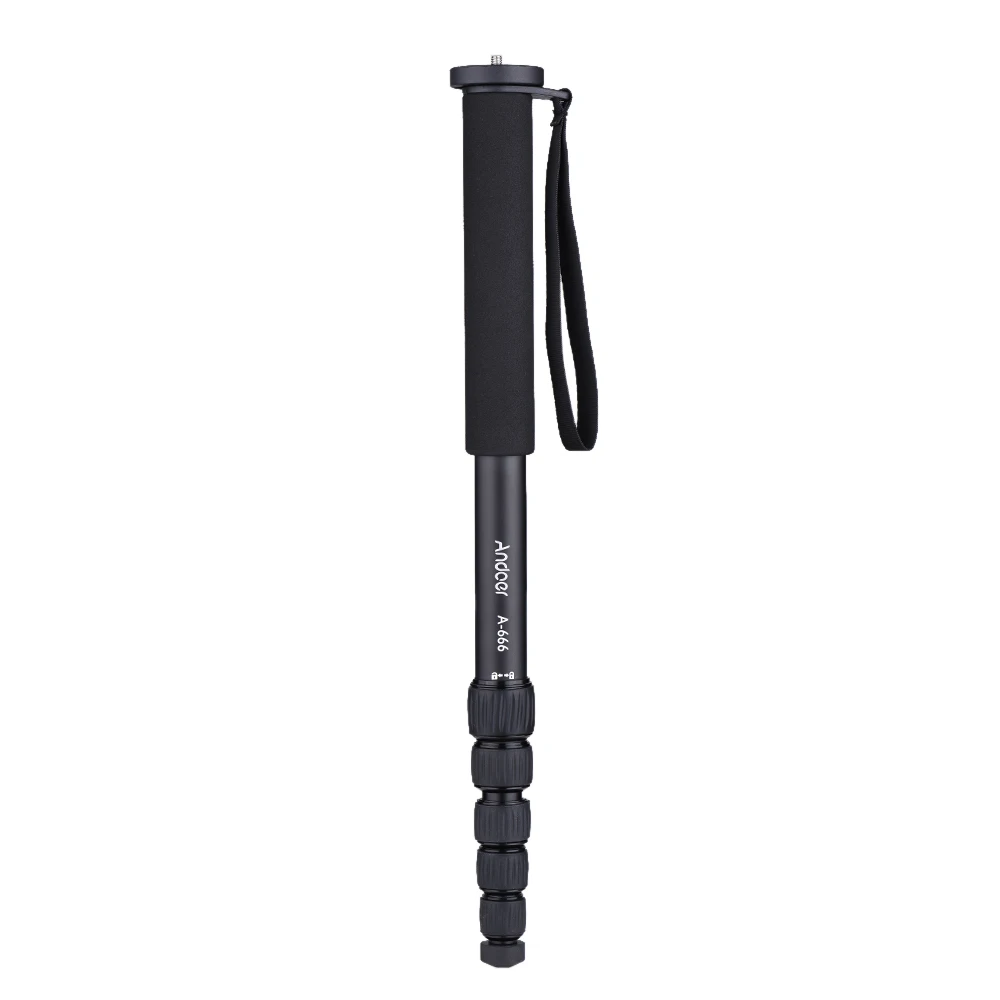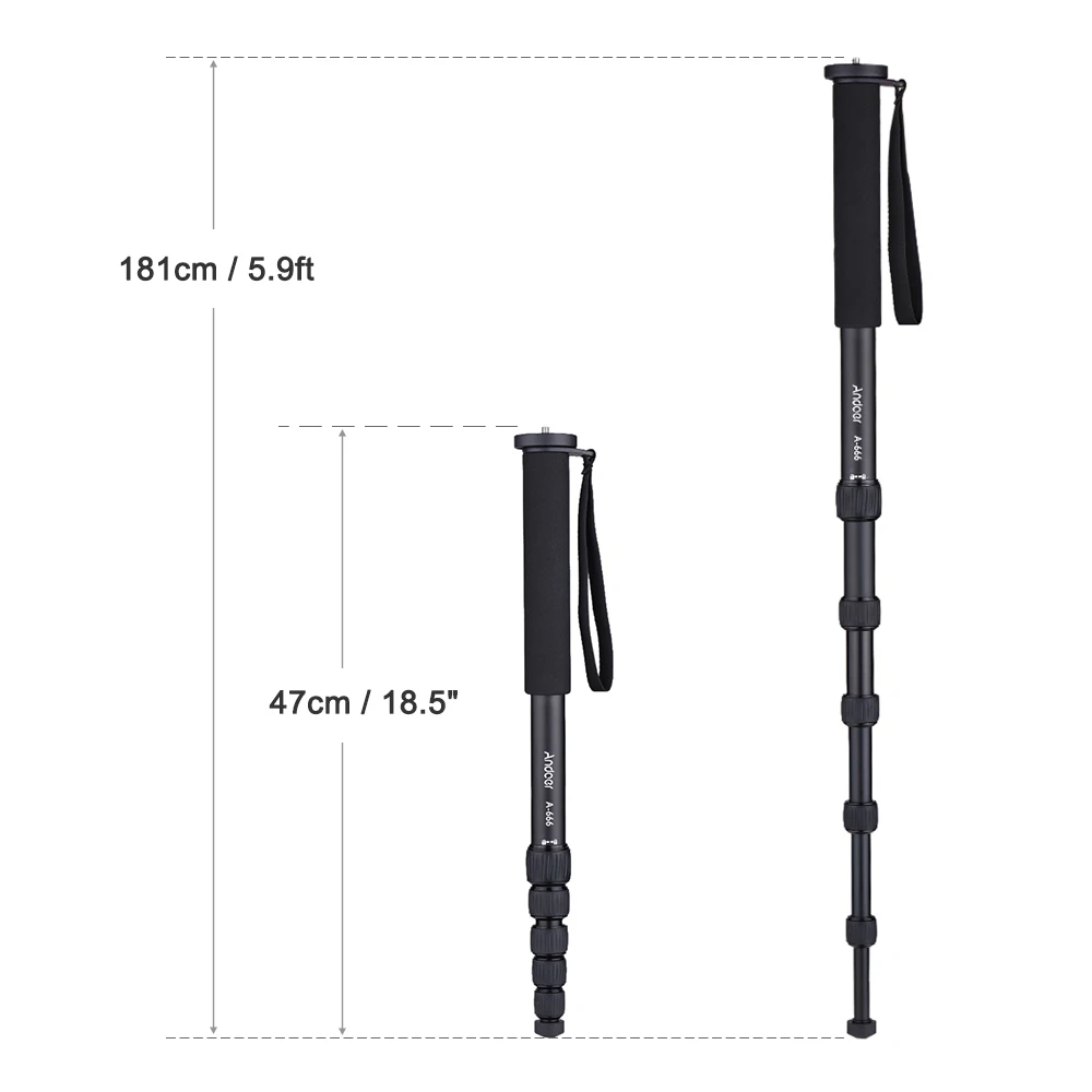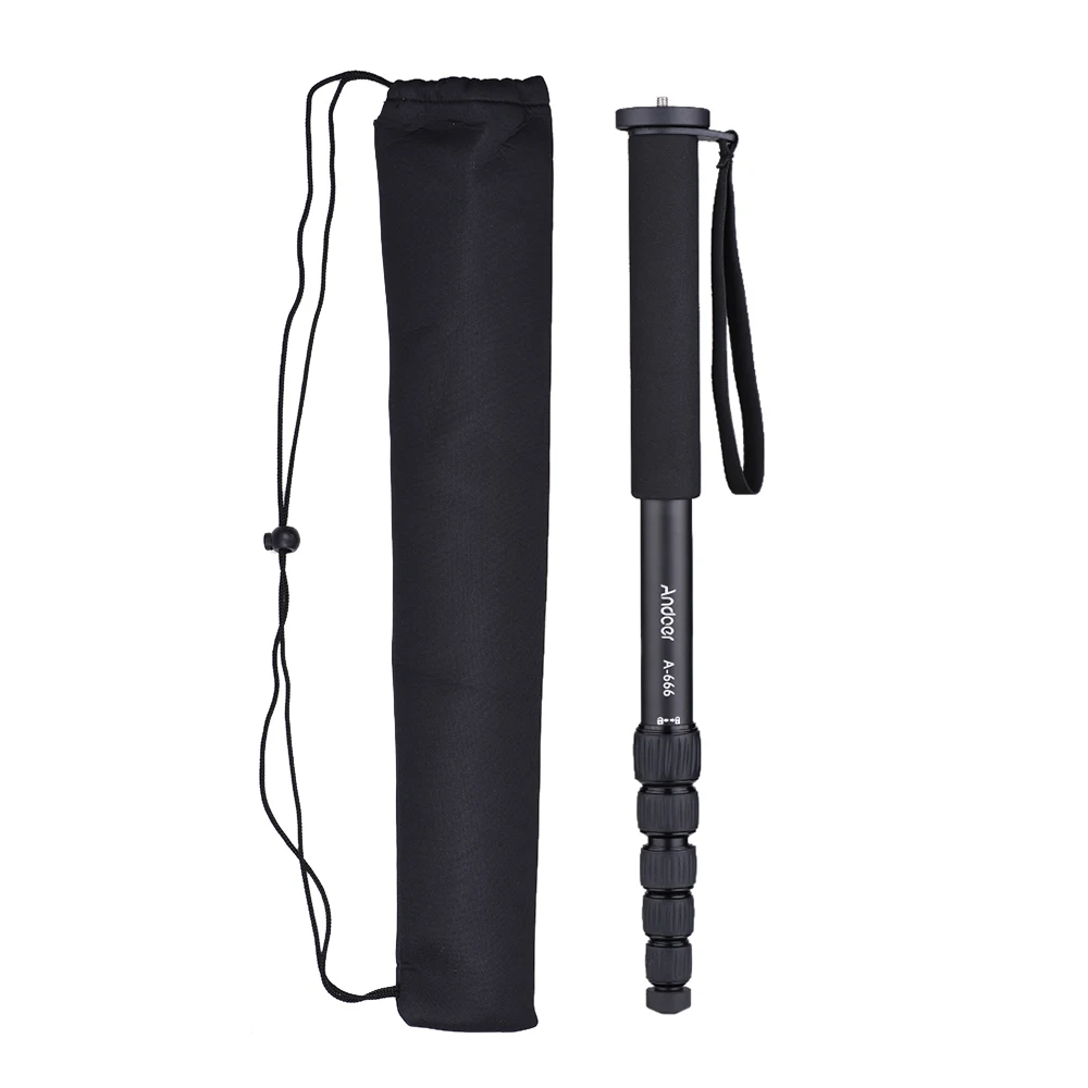 Andoer A-666 монопод из алюминиевого сплава может поддерживать высокую нагрузку до 10 кг/22 фунта. Вы можете использовать его как идеальный держатель камеры и походную палку. 6 секций, максимальная длина 181 см/5,9 футов. Длина в сложенном состоянии 47 см/18,5 "; Поставляется с переносная сумка для переноски.