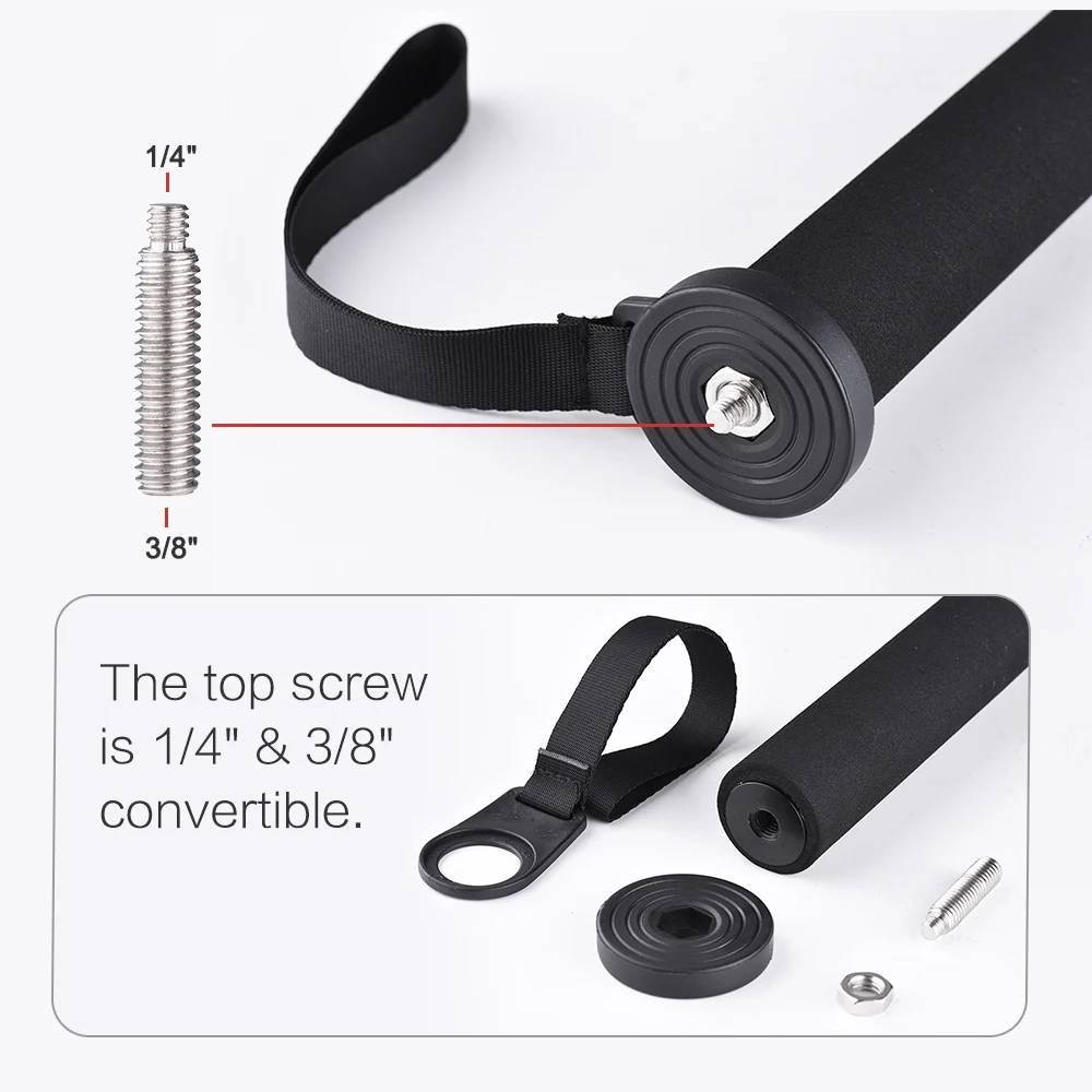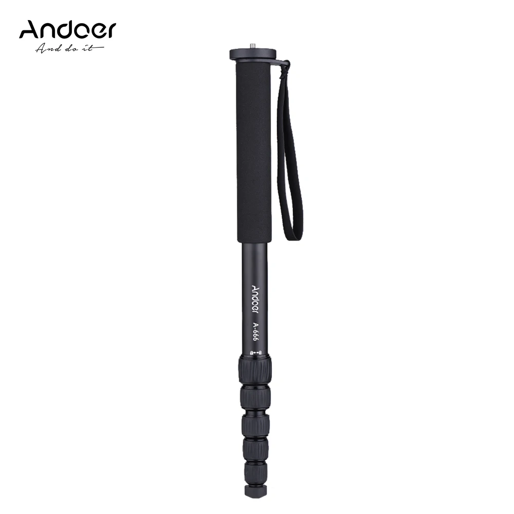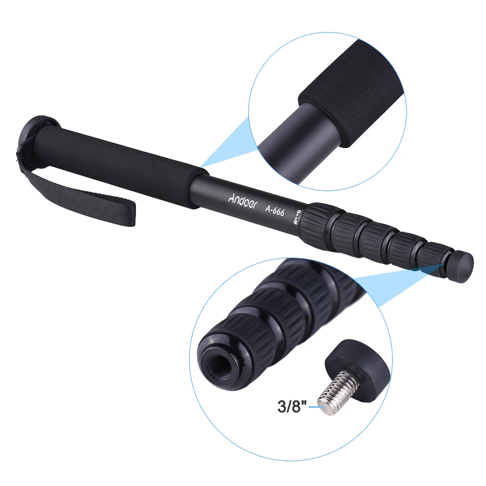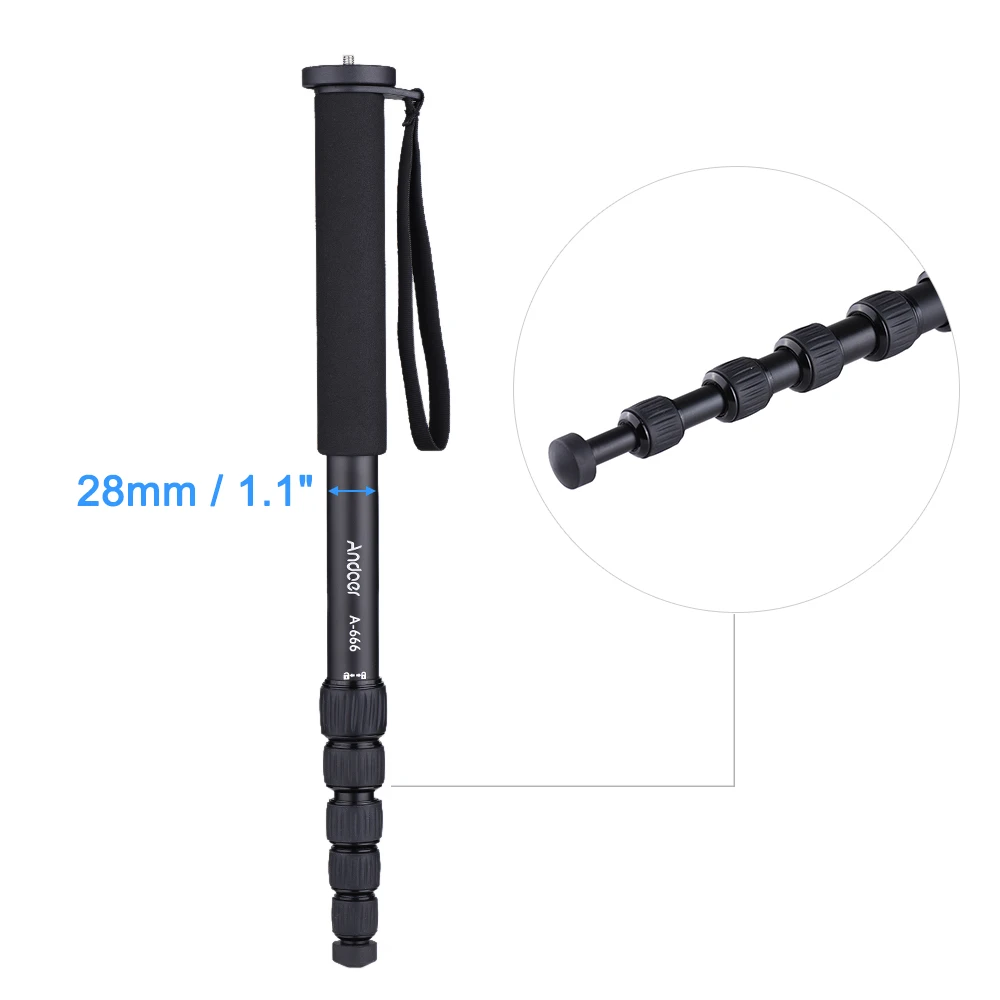 Andoer A-666 монопод из алюминиевого сплава может поддерживать высокую нагрузку до 10 кг/22 фунта. Вы можете использовать его как идеальный держатель камеры и походную палку. 6 секций, максимальная длина 181 см/5,9 футов. Длина в сложенном состоянии 47 см/18,5 "; Поставляется с переносная сумка для переноски.
